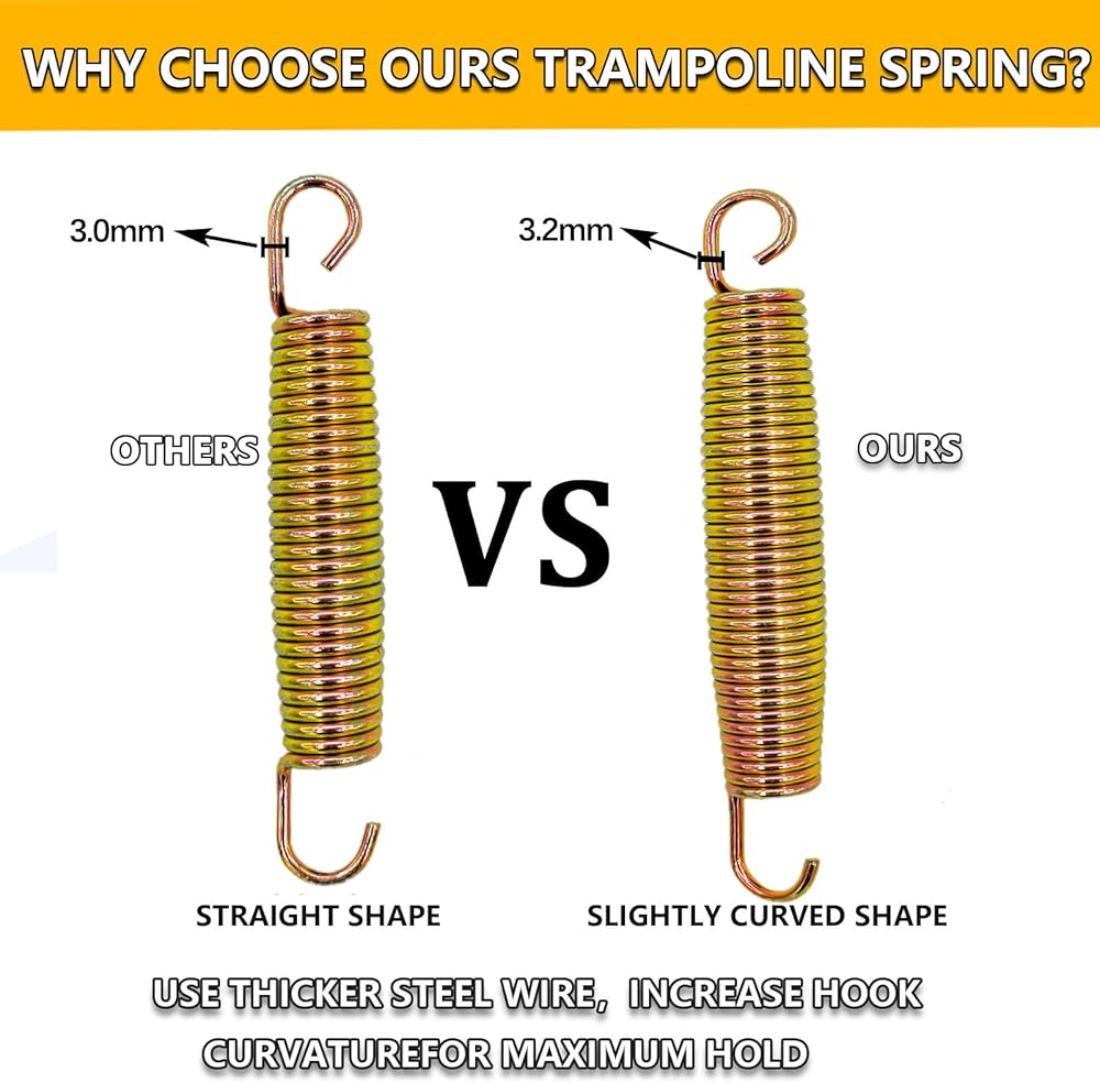 • 【Weather-resistant and long-lasting】-These trampoline springs are designed with zinc plating technology, making them resistant to rust and corrosion. The weather-resistant feature ensures that the springs can withstand outdoor conditions and have an extended service life.