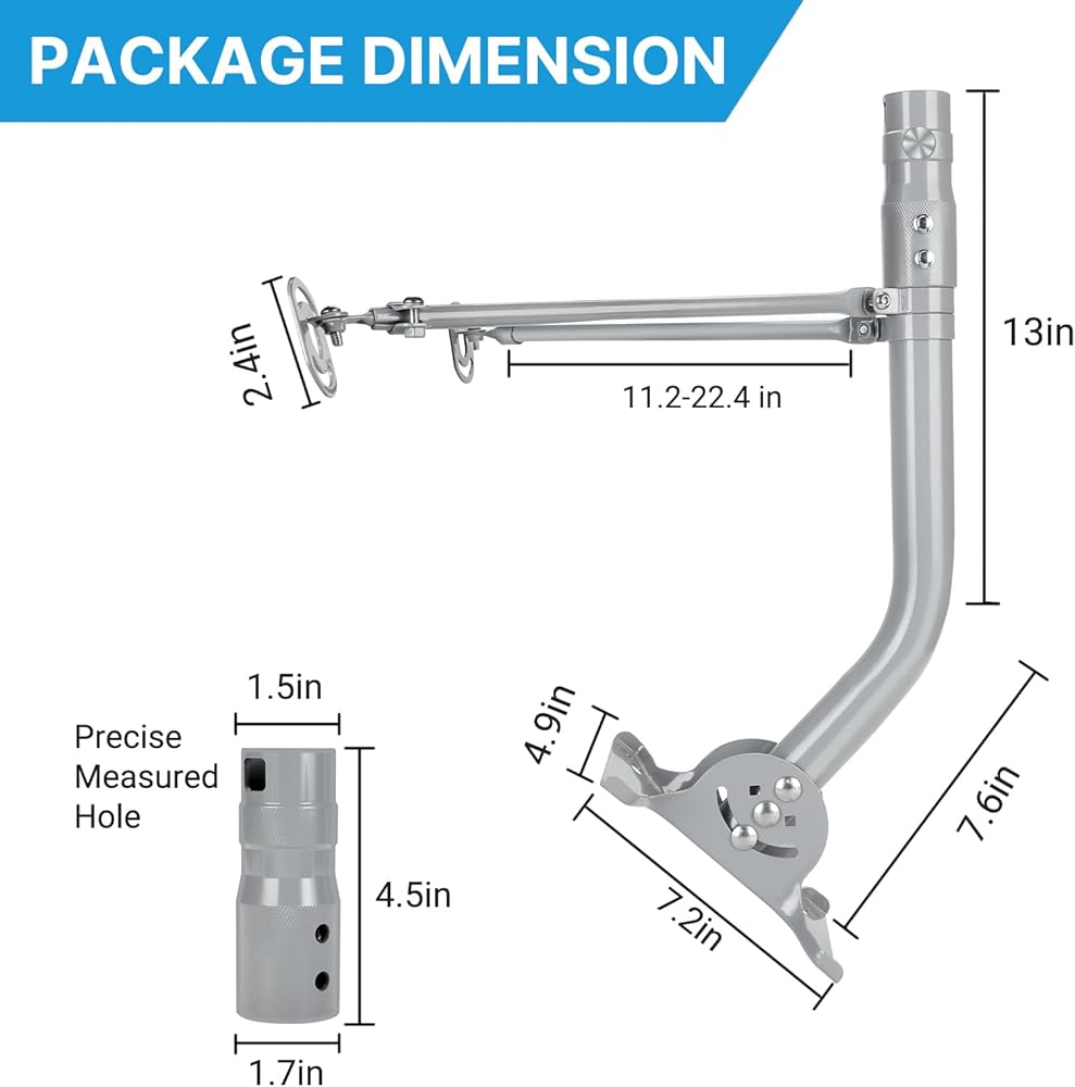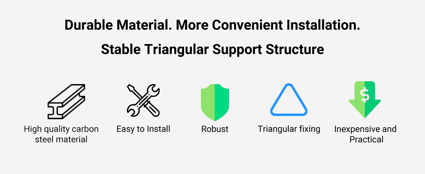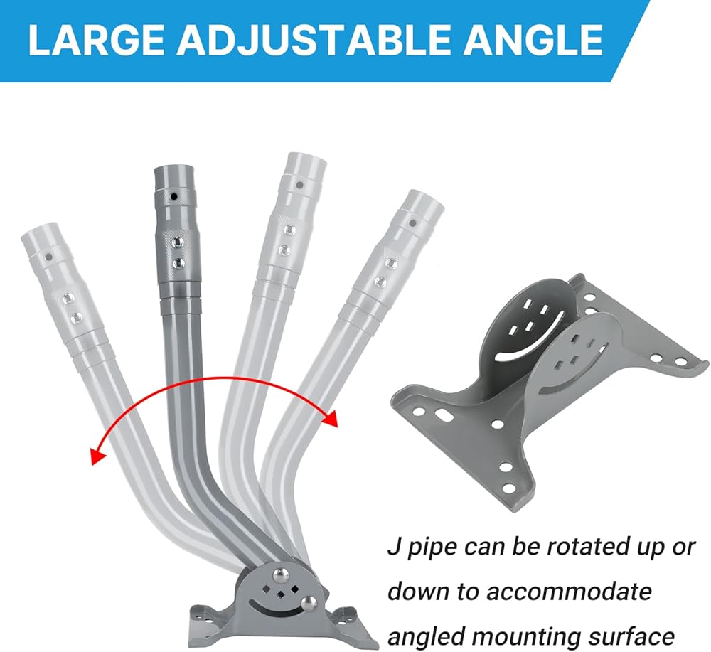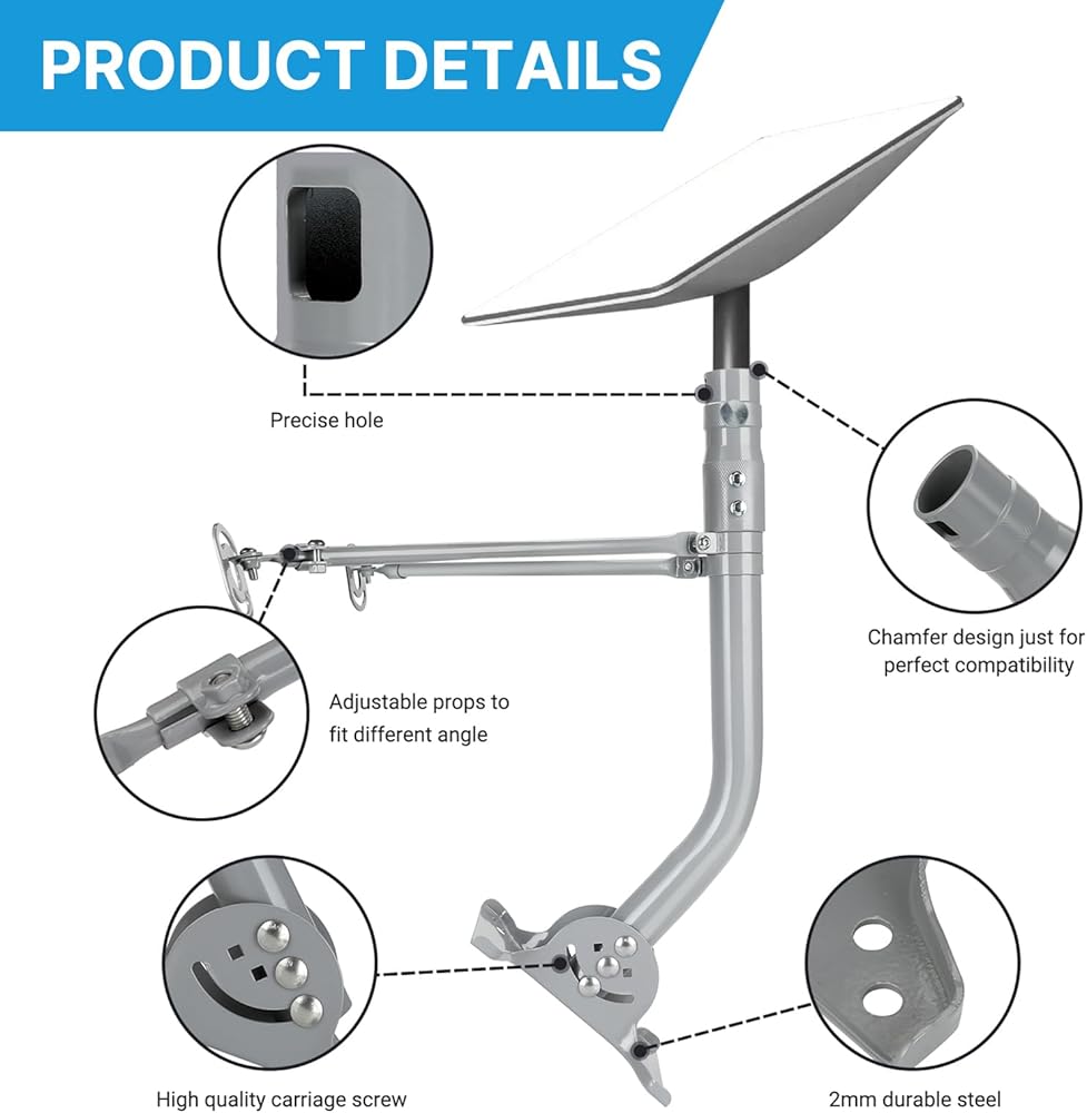 【هيكل ثابت】بالمقارنة مع المنتجات الأخرى الموجودة في السوق، تتميز مجموعة التثبيت الخاصة بنا بتوفير اثنين من قضبان الدعم الإضافية، وكلاهما تمت ترقيتهما من أجل تركيب أبسط، وتعزيز الثبات، والتفكيك الأسهل. الطول والزوايا الثابتة لقضبان الدعم هذه قابلة للتعديل، مما يلبي متطلبات أوضاع التثبيت المختلفة. يضمن الهيكل المثلث المستقر المكون من قضيبي الدعم والأنبوب المنحني ثباتًا ممتازًا حتى في الظروف الجوية السيئة.