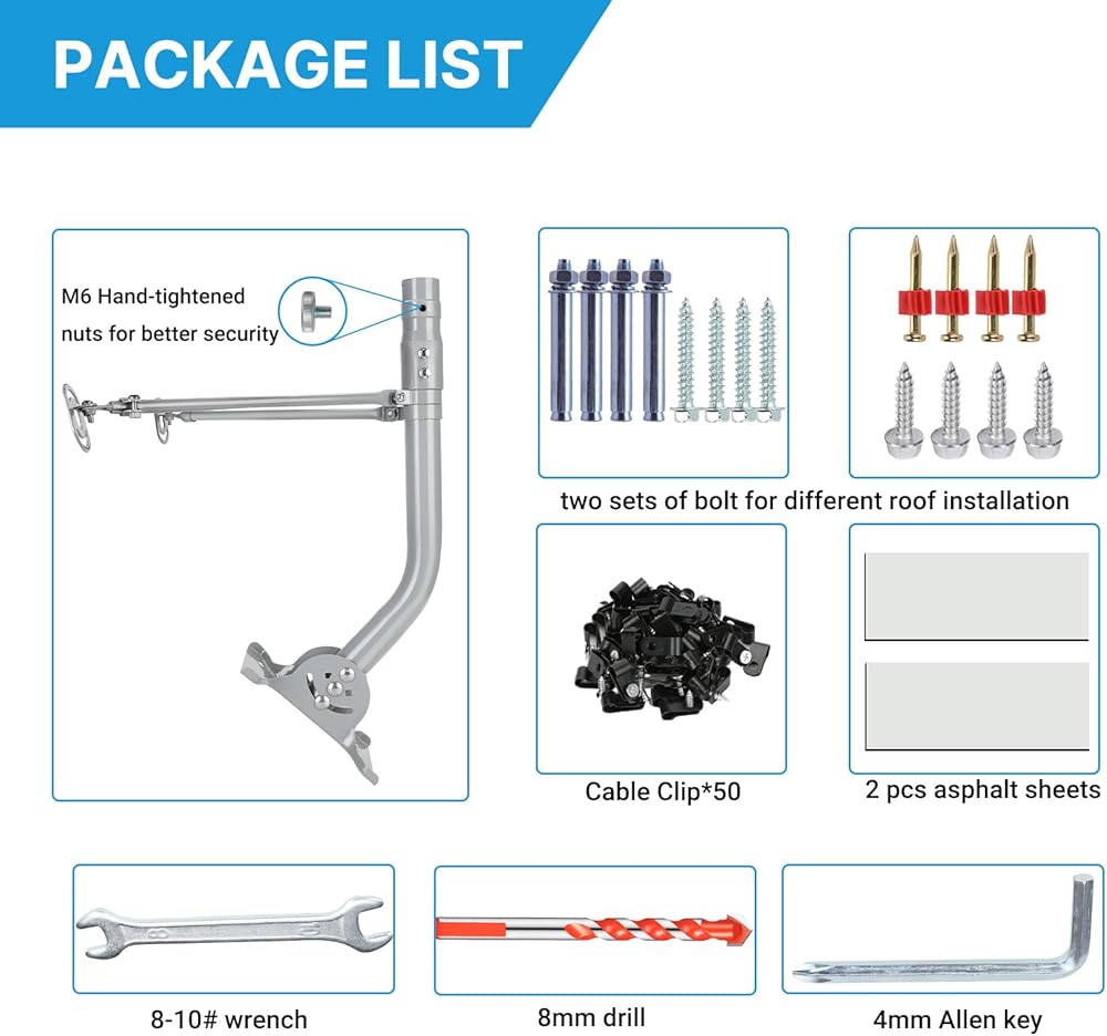 【تصميم مريح】يتم تأمين القسم الذي يربط المحول وقضبان الدعم بمجموعتين من براغي M6*50، مما يوفر حلاً أكثر موثوقية واستقرارًا مقارنةً بمسامير الشد اليدوية المستخدمة في الطرق الأخرى. مع الأخذ في الاعتبار احتياجات المستخدمين المتنوعة والاختلافات في تركيبات السقف، فإننا نقدم مجموعتين من براغي التثبيت، ومسامير التوسيع، ومسامير الخشب. يشتمل قسم قضيب الدعم أيضًا على مجموعتين من البراغي، بالإضافة إلى لقمة مثقاب ومفتاح ربط لتثبيت جميع البراغي. بالإضافة إلى ذلك، يتم تضمين مشابك الكابلات لتأمين خطوط الإشارة، بهدف توفير أقصى قدر من الراحة لك.