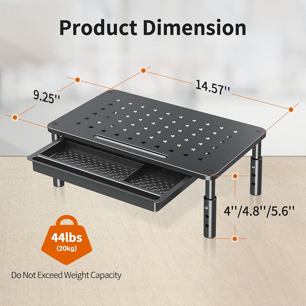 منظم سطح المكتب مع درج: يأتي حامل حامل الشاشة مع درج قابل للإزالة، يمكنك وضع أشياء أصغر فيه والحصول على مساحة إضافية أسفله للوازم المكتبية مثل لوحة المفاتيح والكتب والمستندات وما إلى ذلك.