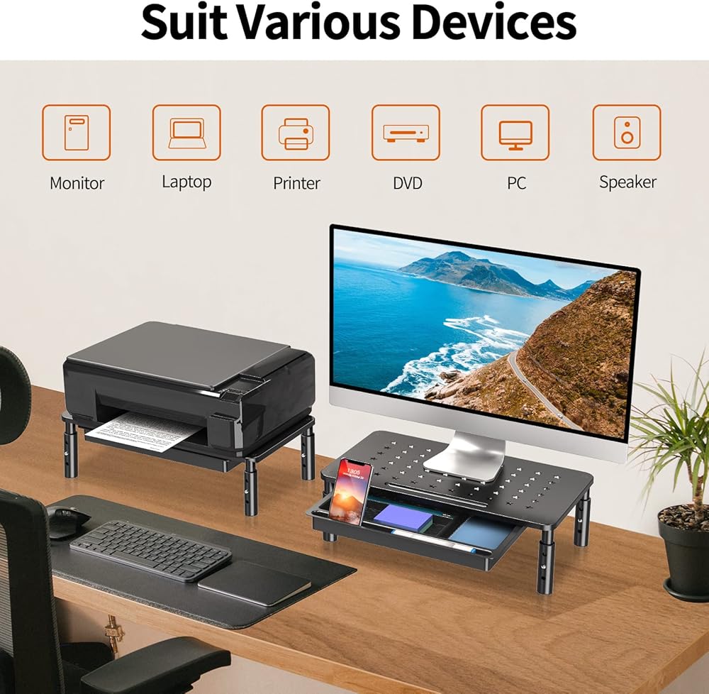 حامل شاشة ELIVED مكون من قطعتين مع درج، حامل شاشة قابل للتعديل بـ 3 ارتفاعات مع مساحة تخزين، حامل شاشة سطح المكتب للكمبيوتر والكمبيوتر المحمول والكمبيوتر المحمول والطابعة (أسود).