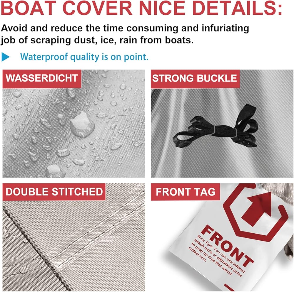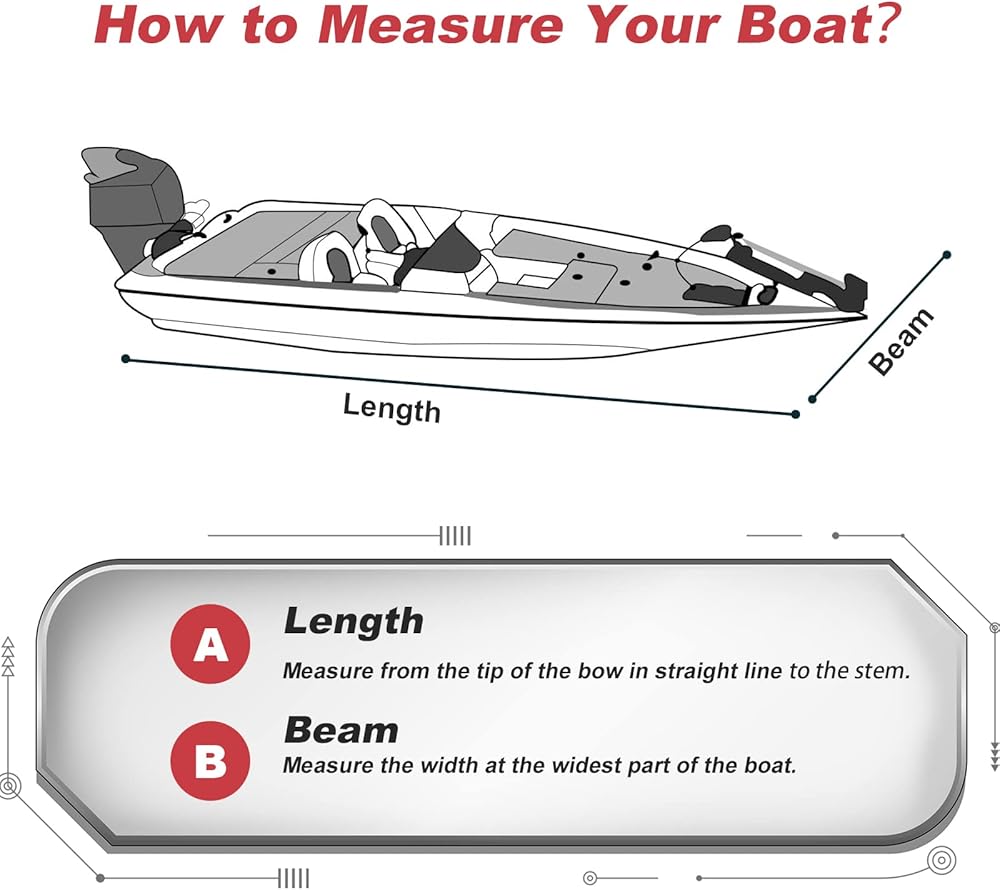 نصائح لطيفة: نحن نفخر بدعم العملاء السريع والمفيد. إذا كانت لديك أي أسئلة أو مخاوف بشأن أغطية القوارب الخاصة بنا، ففريقنا جاهز لمساعدتك. قبل الشراء، نوصي بالتحقق من قياسات طول وشعاع القارب الخاص بك للحصول على الملاءمة المثالية. كنصيحة إضافية، نقترح استخدام كرات الشاطئ المنفوخة أو الأعمدة القابلة للتعديل لدعم أي انحدارات قد تؤدي إلى تجمع مياه الأمطار، مما يضمن أقصى قدر من الحماية لقاربك.
