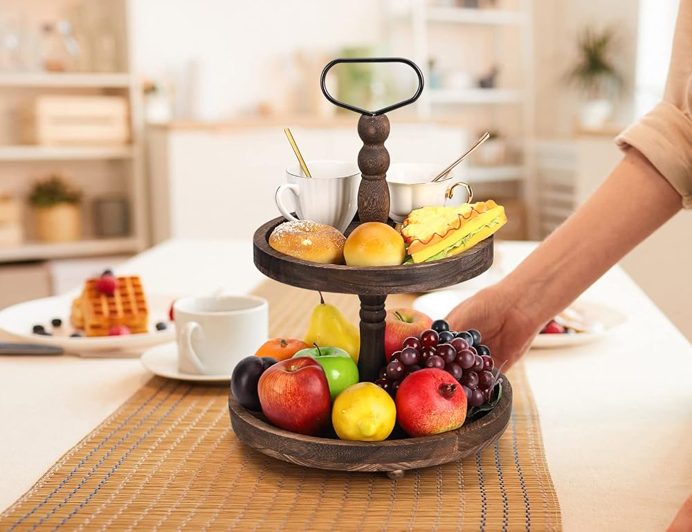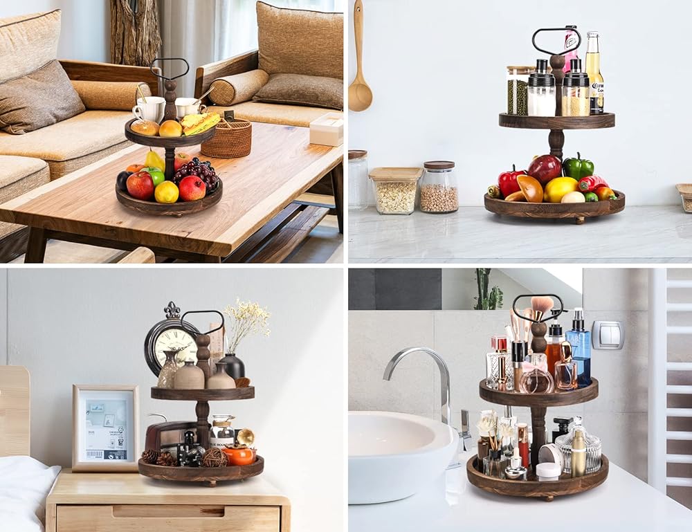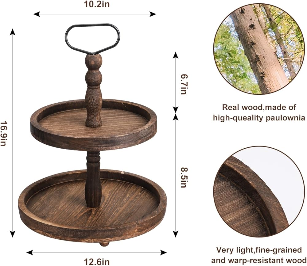 تصميم موثوق ومستقر: هذا الحامل المكون من طبقتين مصنوع من مواد عالية الجودة لصينية خشبية مزخرفة مستوحاة من الطراز العتيق ستحتفظ بها لسنوات قادمة. مصمم بشكل فريد مع قضيب معدني داخلي مثبت في كتلة قوية في القاعدة للحفاظ على ثبات الصينية ذات المستويين قدر الإمكان