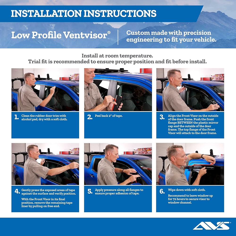 Hit the open road in style with the lowest profile rain guard on the market. The AVS Low Profile Ventvisor is designed to complete the look of your vehicle by adding subtle style while maintaining the functionality you desire from a side window deflector. Made of impact resistant acrylic with a dark smoke finish or warp-resistant ABS construction with a matte black finish, this Ventvisor is strong yet flexible enough to withstand all of nature's elements, from rain and ice to scratching branches and glaring sun. It comes custom- molded to match your vehicle's year, make, and model, and hugs the contours of your car for a sleek, aerodynamic look. Installation is hassle-free and can be done it minutes from the comfort of your own home. No drilling or tools required, just attach using the included 3M automotive grade adhesive. Once installed, it's easy to refresh your morning commute by rolling down your windows and circulating air through your cab, keeping it fresh and scent-free even in bad weather. When parked, leave the windows cracked to prevent heat buildup while keeping rain out. All AVS products are proudly made in the USA with global materials and are backed by a Limited Lifetime Warranty.
