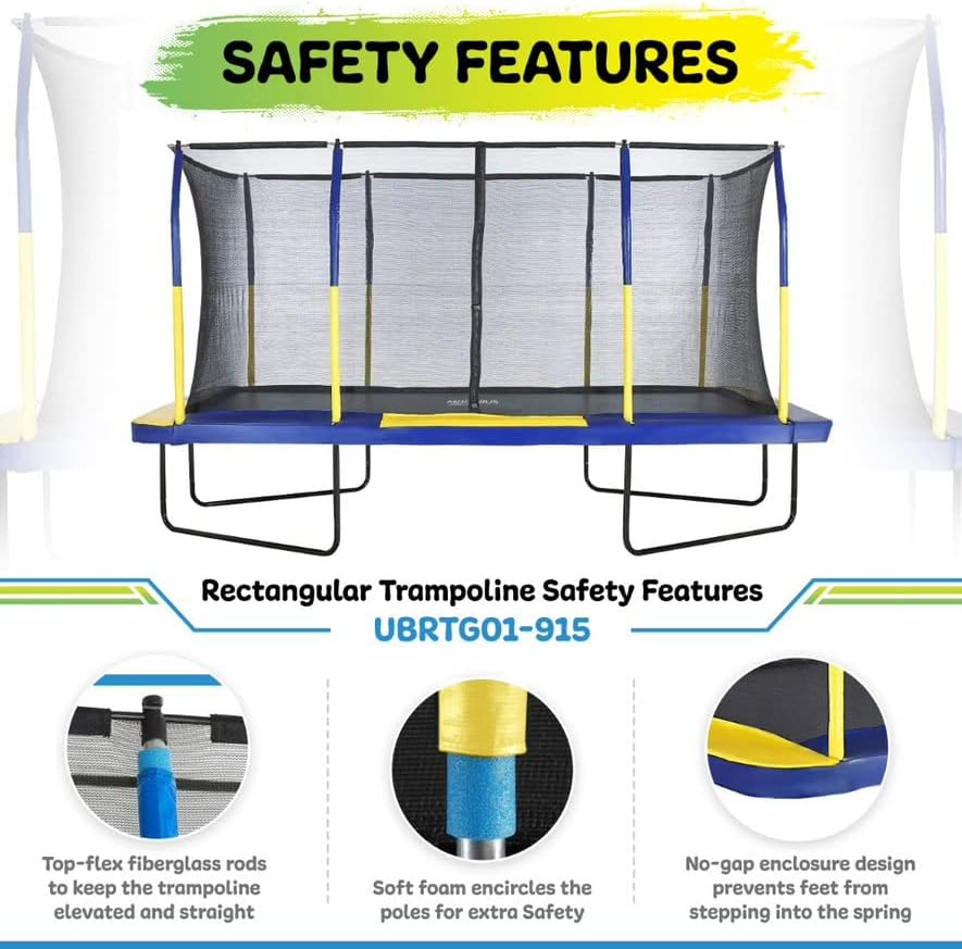 • Extra Space for Diverse Entertainment: Rectangular Trampoline's Enclosure Net is enclosed with a top-flex fiberglass rod to keep it elevated and straight, allowing kids to bounce as high as possible. The rod passes through the pole caps to maintain integrity among the curved poles, enabling bigger flips and enormous outdoor fun for children. The extended outdoor trampoline provides ample space to practice gymnastics for kids and adults