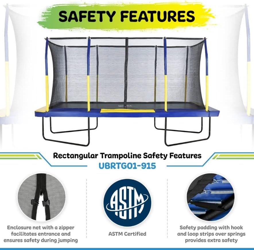 • Safe Outdoor Fun: We kept child safety on top priority in our Trampoline Rectangle. Soft foam encircles the poles to absorb the magnitude of collisions by accident. No-gap enclosure design prevents feet from stepping into the spring, and safety padding w/ velcro strips (each corner) over springs provides additional safety. Enclosure net with zipper facilitates entrance and ensures safety while jumping. Let's make your family day joy-inducing with extraordinary fun on a recreational trampoline