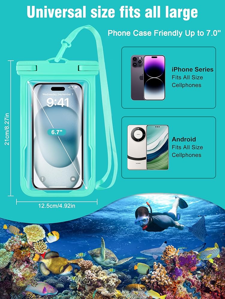 تصميم كبير وصديق للحافظة - تم تصميم حافظة الهاتف المقاومة للماء لتناسب معظم الهواتف المحمولة مثل iphone 15 pro max وGalaxy S24 مع أو بدون حافظة رفيعة، بقياس 7.0 بوصة. يوفر هذا تأمينًا إضافيًا لهاتفك، مما يسمح لك بالحفاظ عليه محميًا دون متاعب إزالة الجراب