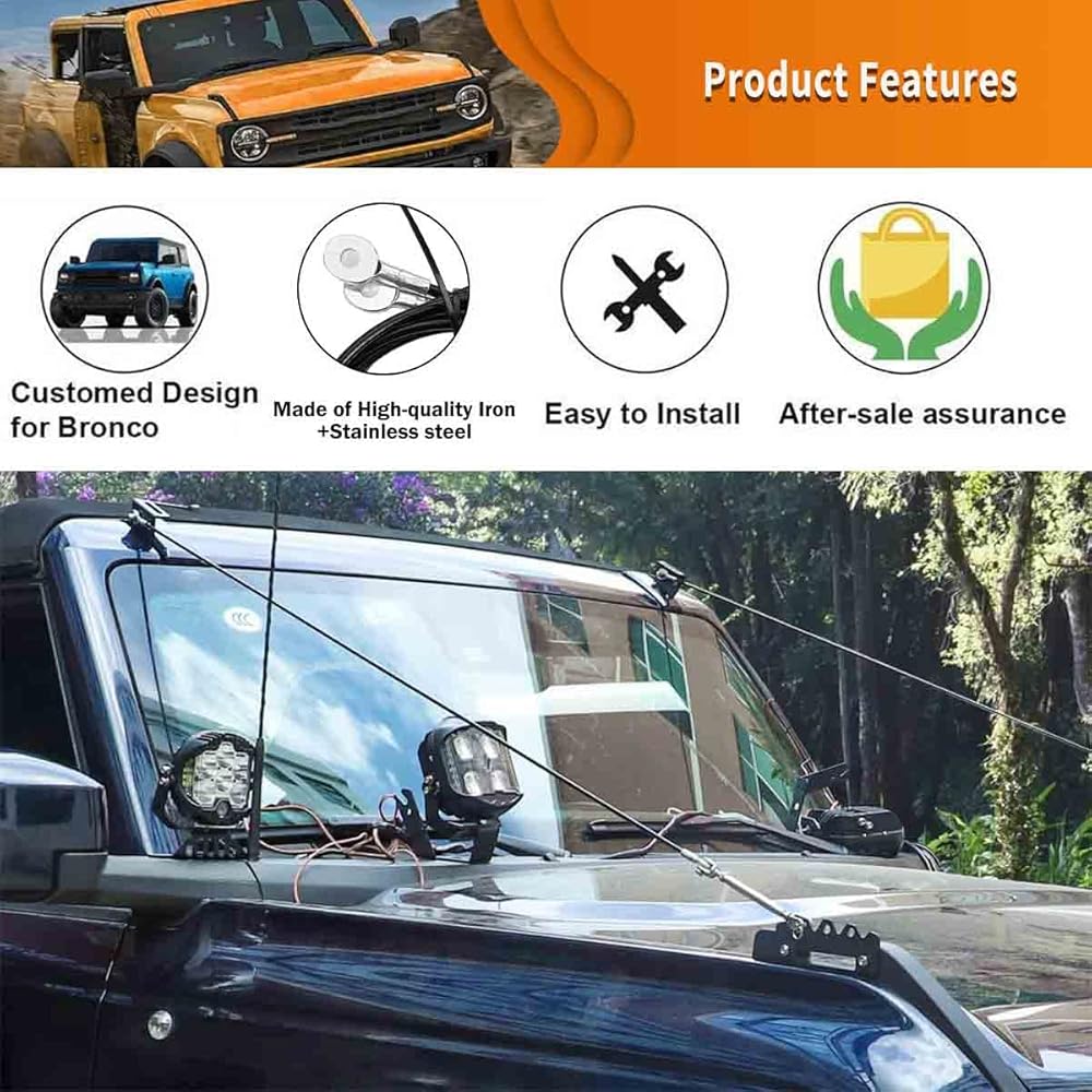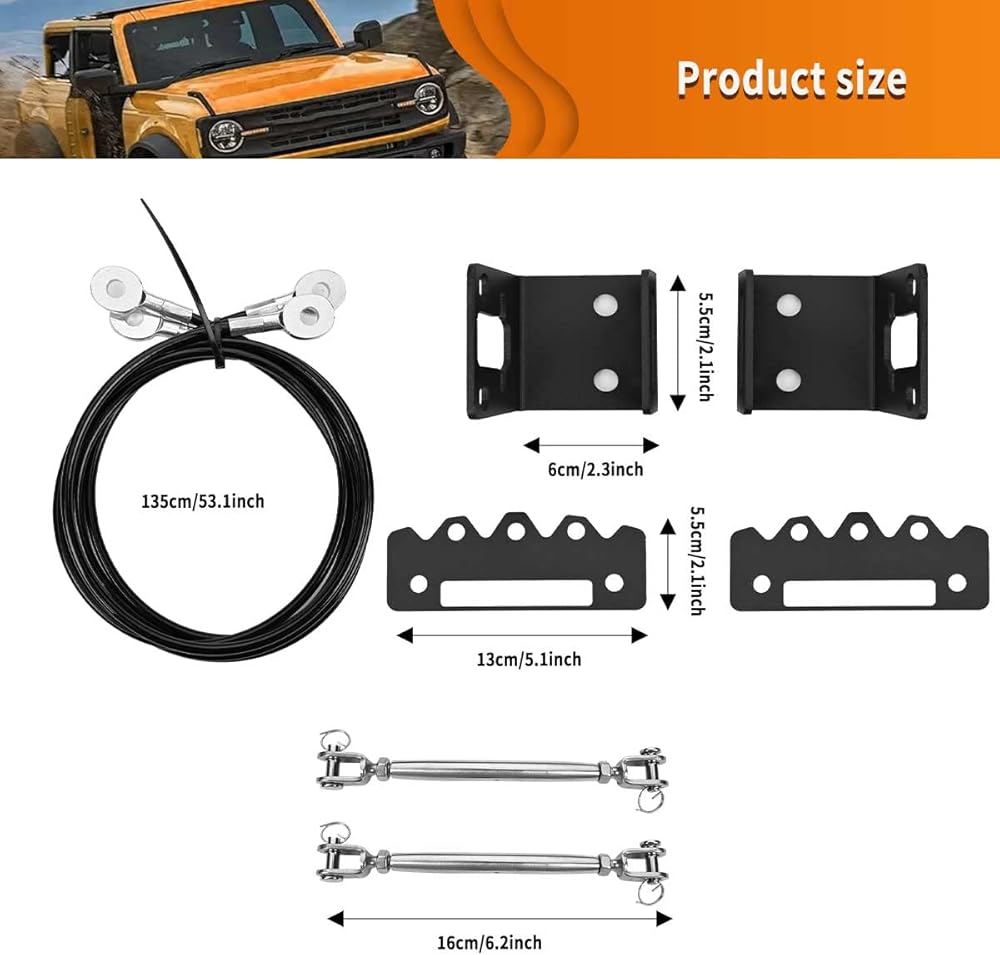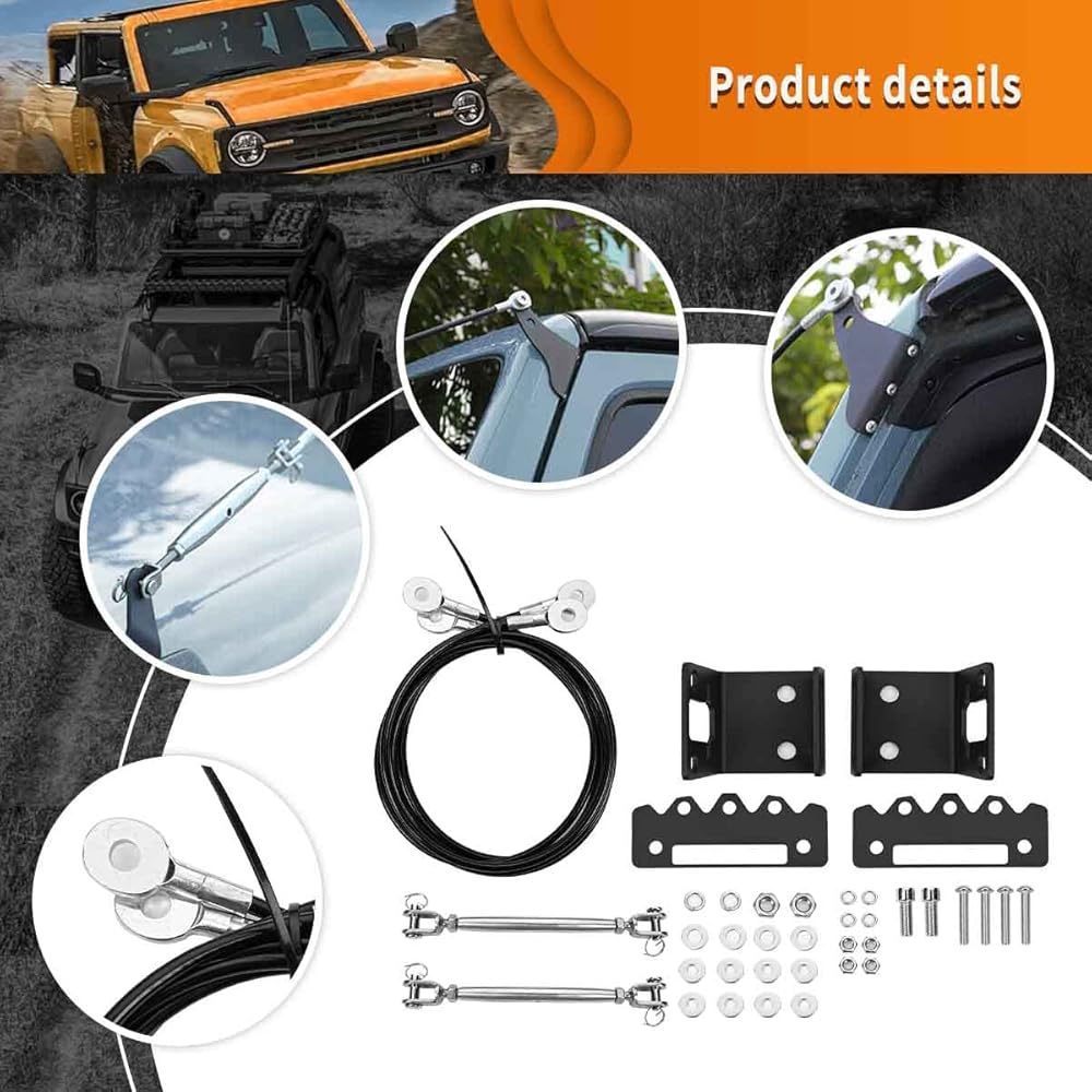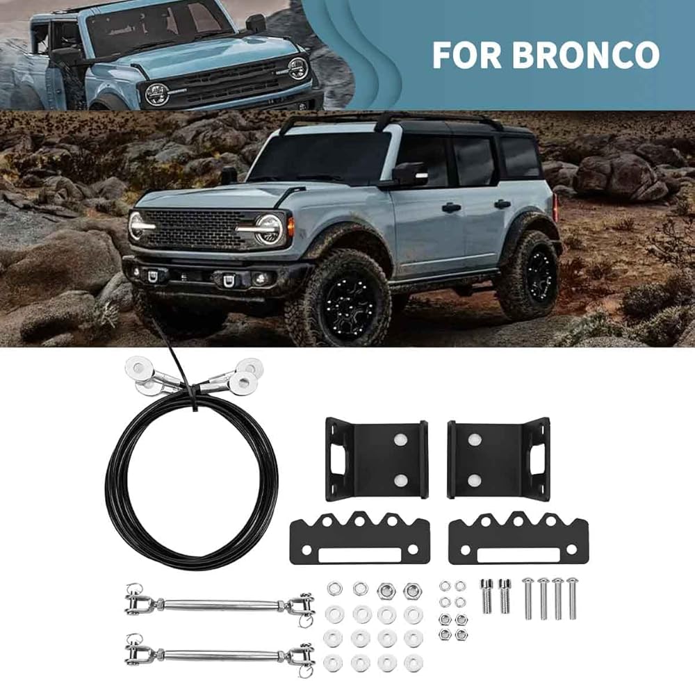 مجموعة رافعات الأطراف القابلة للتعديل مناسبة لسيارة Ford Bronco Offroad 2/4 Door 2021 2022 2023. إنها مناسبة للجزء العلوي الناعم والجزء العلوي الصلب، وليس لرياضة Ford Bronco، ولا للسقف مع رف الأمتعة، وهيكل ثابت، ويدوم طويلاً. حبل سلكي داخلي، توتر عالي، قوي ومتين
