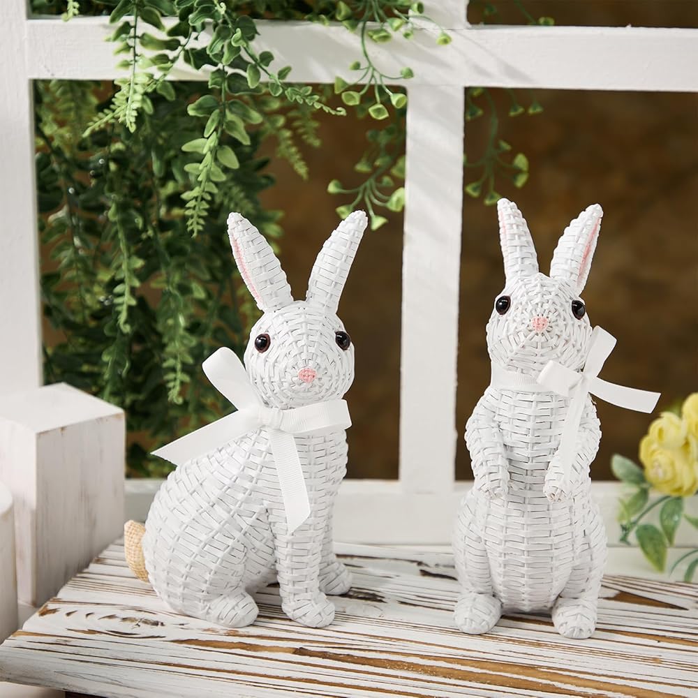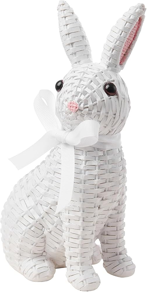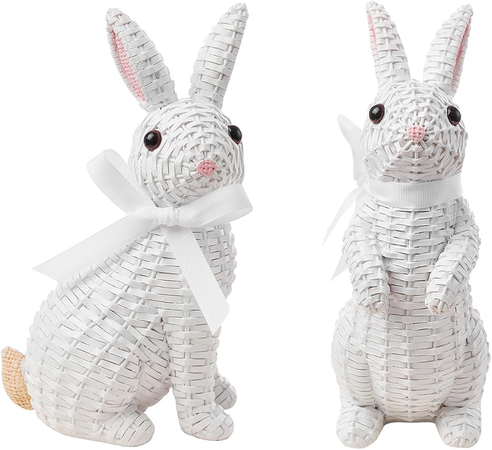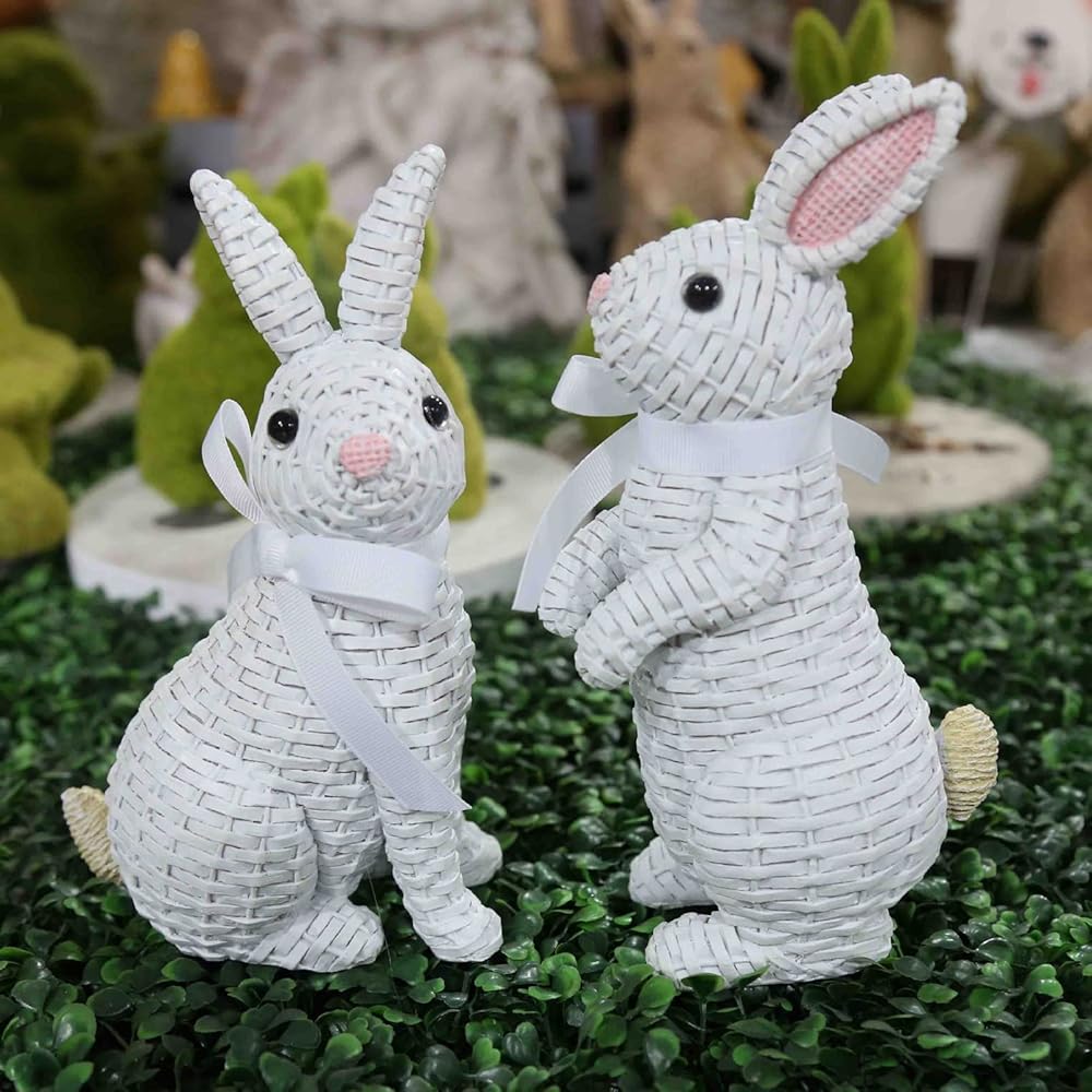 • 🐇[Easter Decoration] :Made of high-quality resin and designed with imitation rattan weaving, the rabbit is more realistic, standing or squatting, vividly displayed in front of people. The appearance of pink, gray, white and other colors allows you to find your favorite style in Easter design, further enhancing the atmosphere of Easter