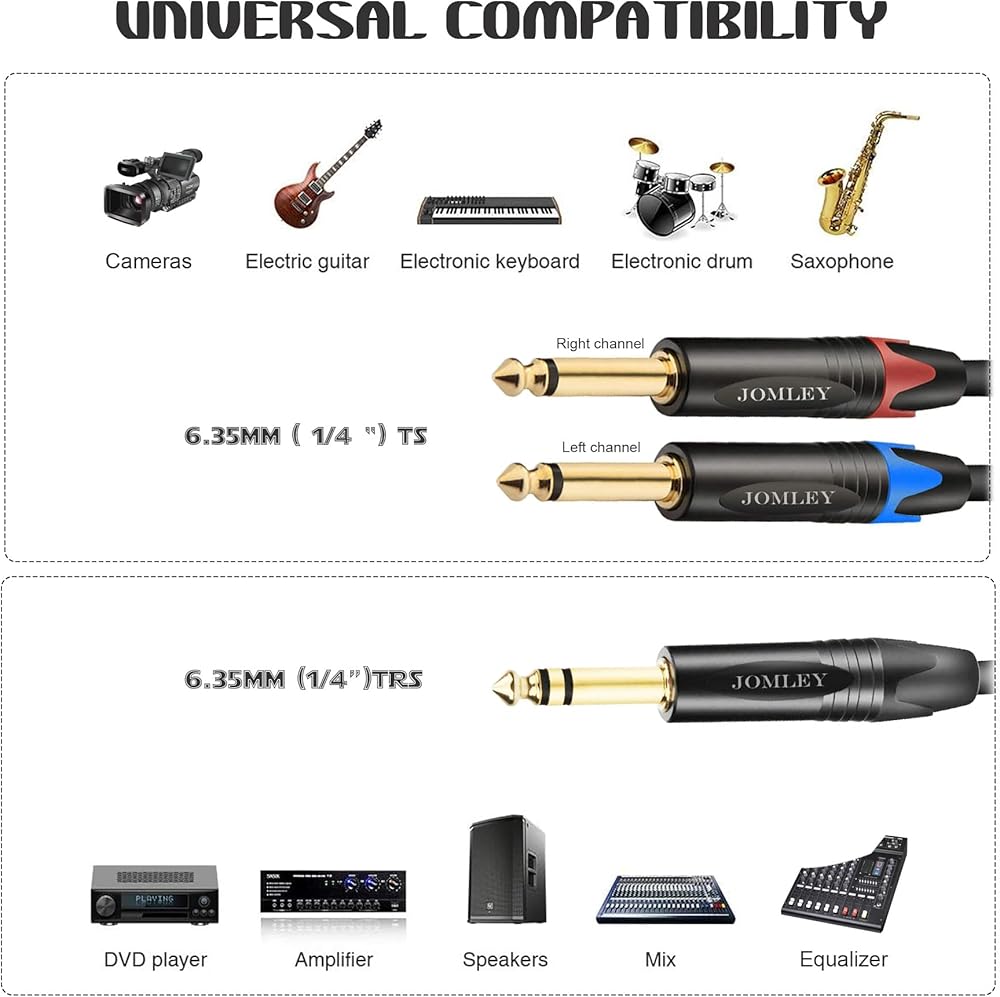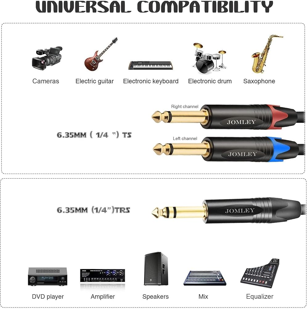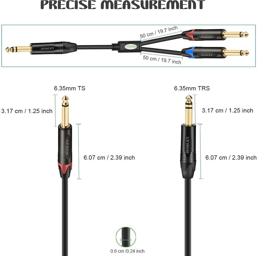 يتم استخدام كابل ستيريو TRS مقاس 1/4 بوصة إلى كابل إدخال أحادي TS مقاس 1/4 بوصة عادةً في استوديوهات التسجيل وتطبيقات الصوت المباشر لتوصيل إشارة صوتية من وحدة خلط إلى معالج إشارة خارجي، مثل الضاغط أو EQ. مثالي للاستخدام في أجهزة الصوت والفيديو، ويمكن استخدامه على المعدات المنزلية مثل DVD/VCD والجيتار ومستقبل الميكروفون اللاسلكي وما إلى ذلك. احصل على صوت بجودة احترافية.