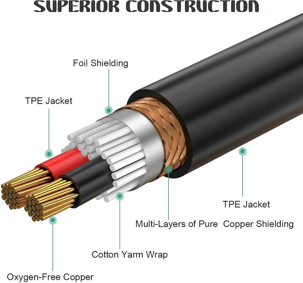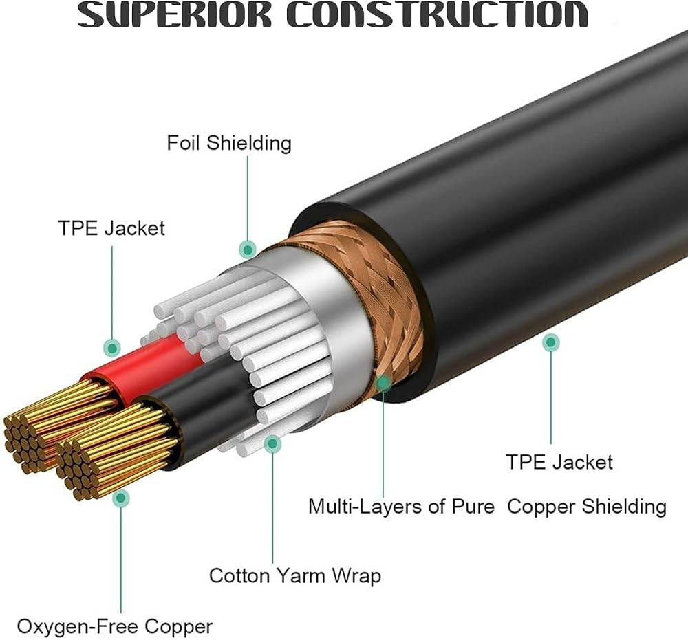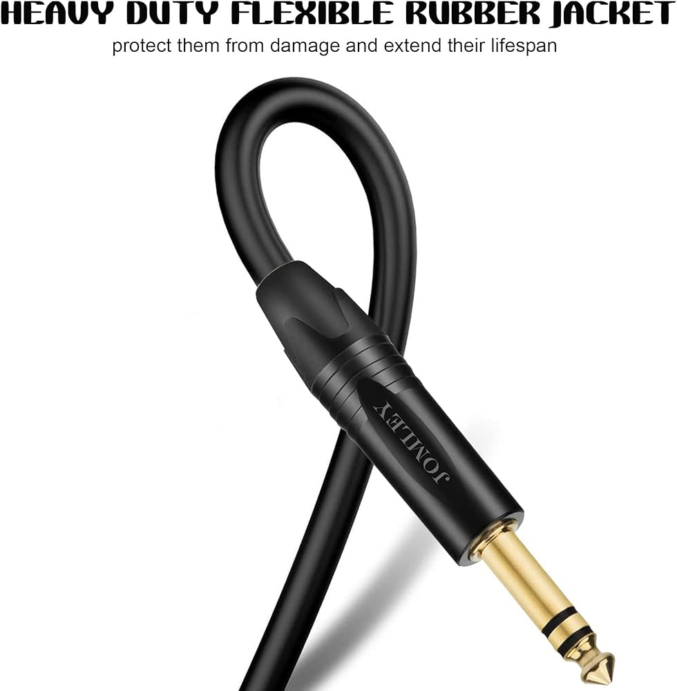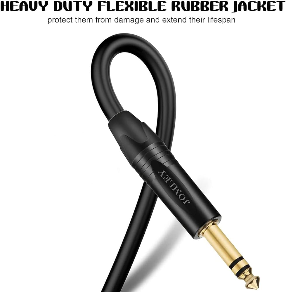 كابل كابل الصوت 1/4 إلى 1/4 مع سترة مطاطية مرنة شديدة التحمل، يحميها من التلف ويطيل عمرها الافتراضي. مرونة المادة المطاطية تمكن من ثني السترة بسهولة والمناورة حول العوائق، مما يجعلها مناسبة للاستخدام في الأماكن الضيقة والمناطق التي يصعب الوصول إليها. يمكن أن تقاوم التآكل مع مرور الوقت. القطر الخارجي للكابل 6.0 ملم (0.24 بوصة).