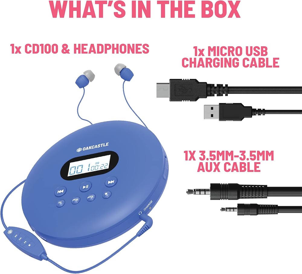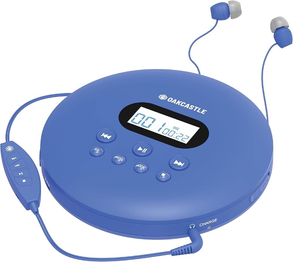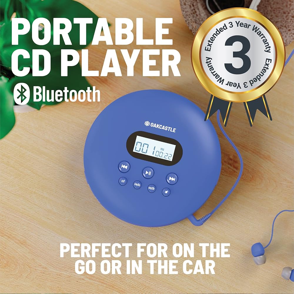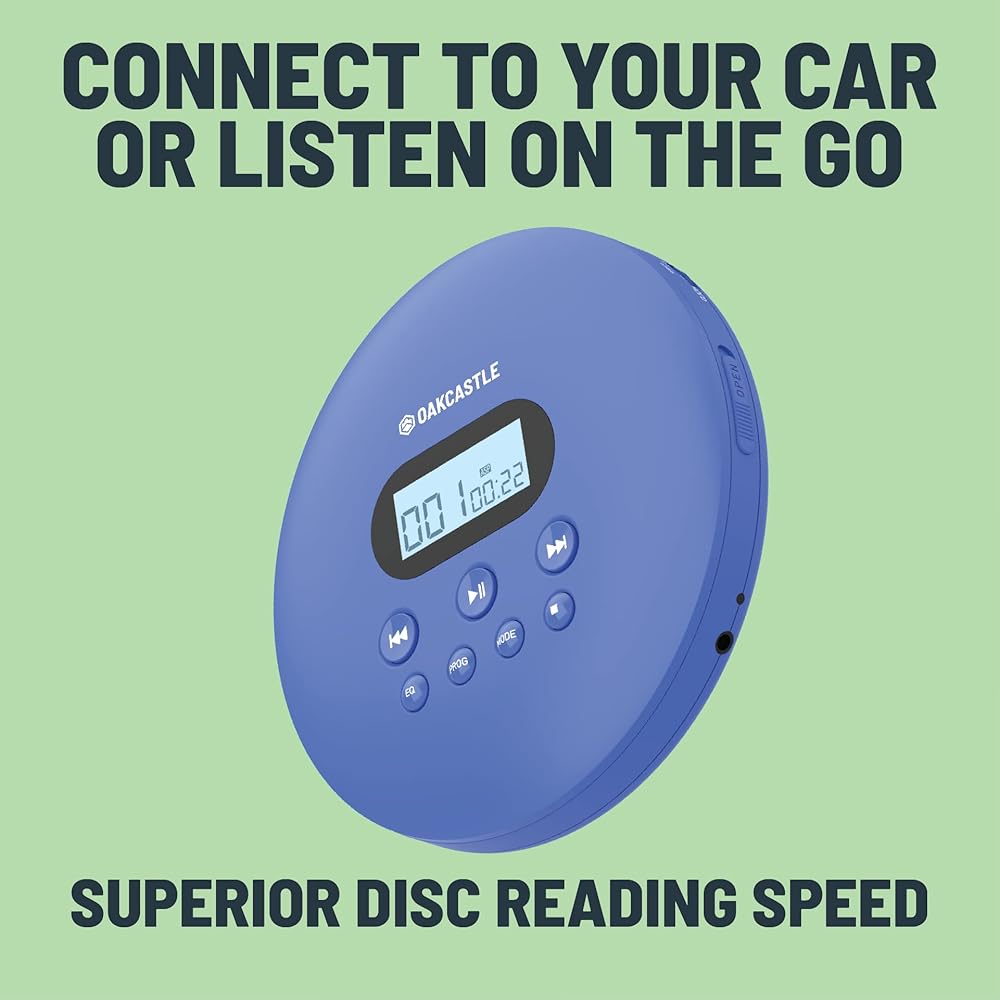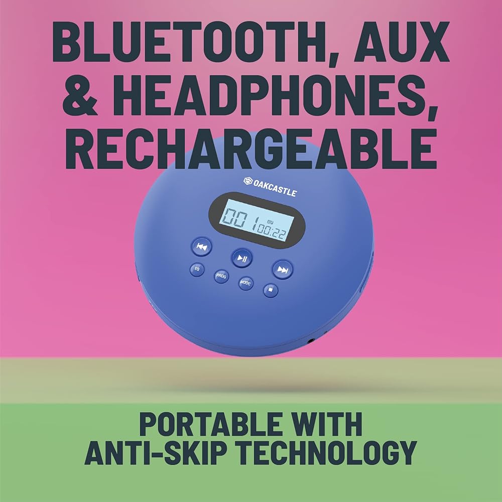 مشغل أقراص مضغوطة محمول، مشغل أقراص مضغوطة محمول قابل لإعادة الشحن مع بلوتوث 5.3، وقت تشغيل 12 ساعة، مشغلات أقراص مضغوطة صغيرة للسيارة (AUX فقط) | مشغل أقراص مضغوطة محمول Oakcastle CD100 مع سماعات رأس، CD Walkman، Discman (أزرق)