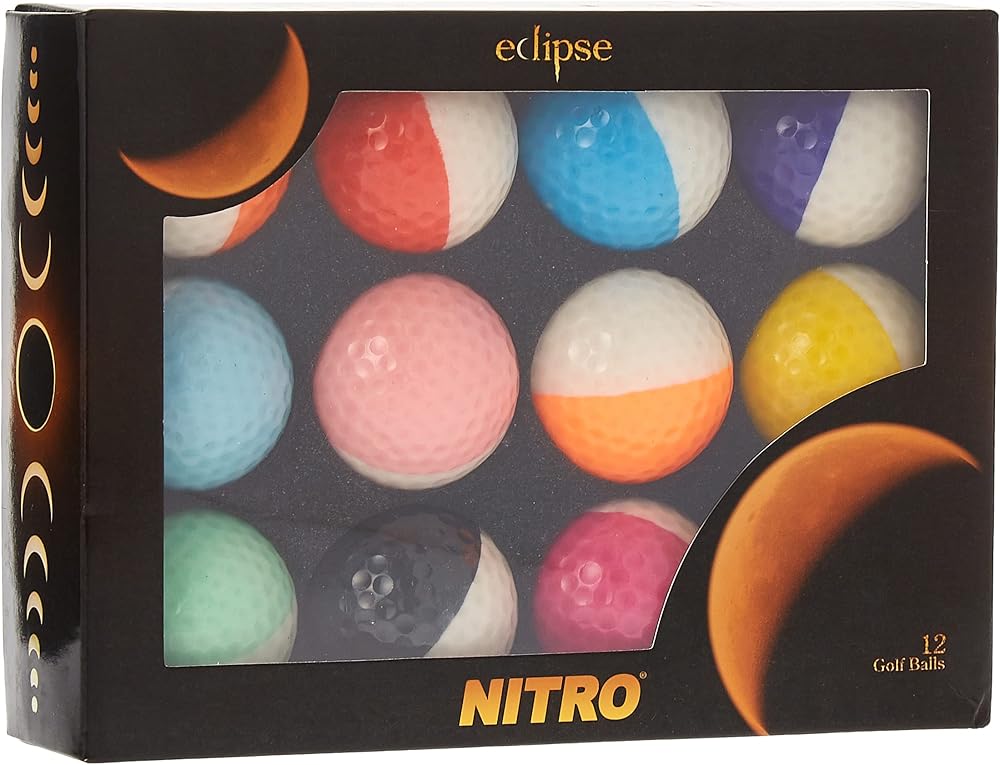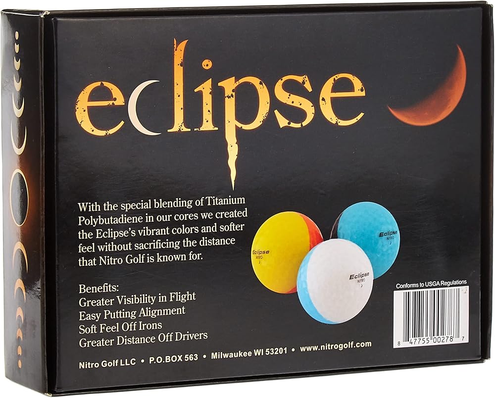Nitro Eclipse is our use of Tu Tone's proprietary technology, creating our first of two color semi-transparent golf ball, The Eclipse. With the special blending of Titanium Polybutadiene in our cores, we created the Eclipse's vibrant colors and softer feel, without sacrificing the distance that Nitro Golf is known for.