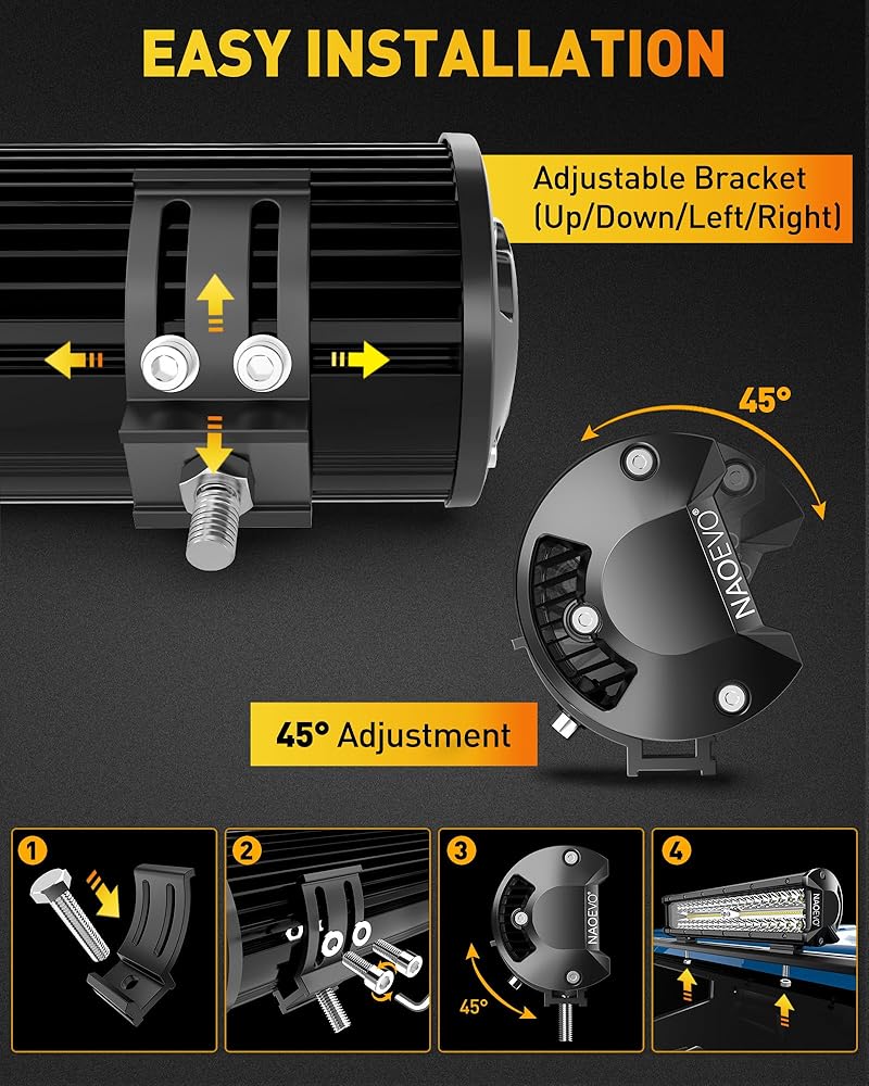 🚙【شريط LED كومبو للبقع والفيضان】يتميز شريط الضوء LED بعاكس ضوء كشاف 15 درجة لتوفير إضاءة عالية التركيز وإضاءة لمسافات طويلة، بينما يوفر شعاع الفيضان 120 درجة تعرضًا أوسع للمنطقة. بالإضافة إلى ذلك، هناك دعامة قابلة للتعديل بزاوية 45 درجة لإعادة تحديد موضع سهل ومرن لتغيير اتجاه الشعاع. المزيج القوي هو الخيار الأفضل في القضبان الخفيفة!
