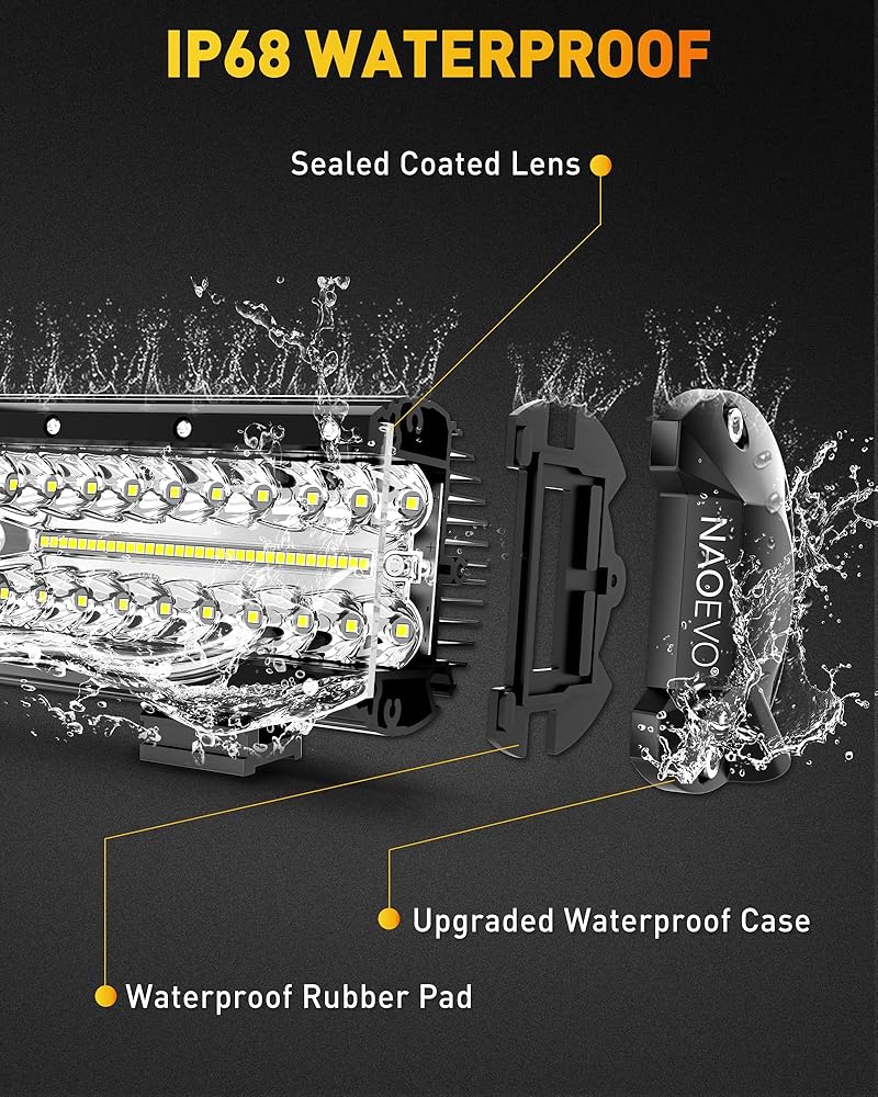 🚙【أداء متميز】تعتمد مجموعة شريط الضوء على غطاء من الألومنيوم المصبوب وتقنية إغلاق متقدمة، ويصل مستوى مقاومة الماء إلى IP68، مع لوحة عدسات PC متينة، والتي تقاوم بشكل فعال الطقس المتغير والقاسي. بالإضافة إلى ذلك، توجد 10 مراوح تبريد في الجزء الخلفي من الضوء لتبديد الحرارة بكفاءة. تعمل هذه الميزات على تحسين عمر مصابيح LED حتى 50000 ساعة. ضمان أداء موثوق به حتى في البيئات الأكثر تحديًا.