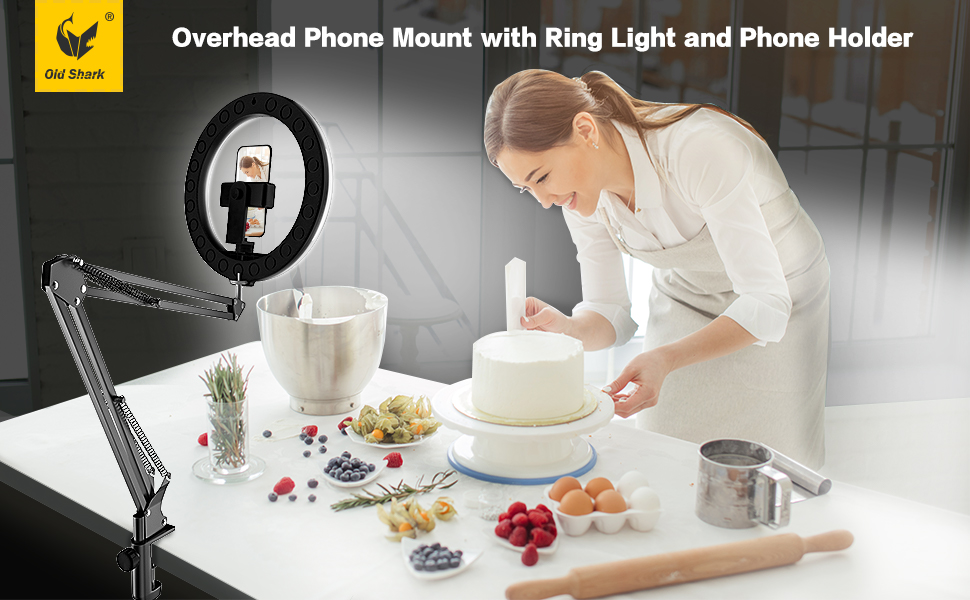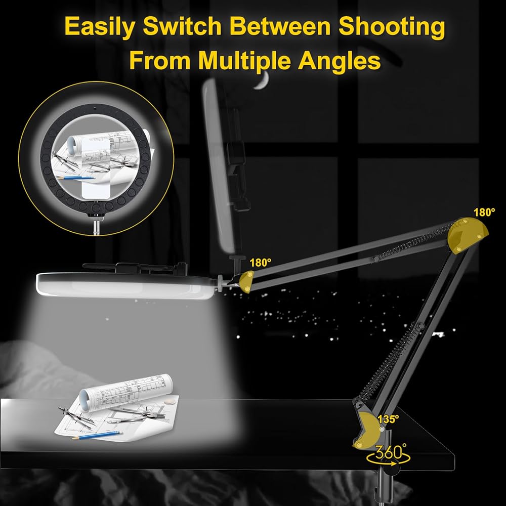 【تعديل سهل للزوايا المتعددة】 يمكن لحامل الهاتف العلوي أن يلبي أي زاوية تحتاجها. الضوء الدائري متصل بالذراع. يمكن تعديله بحرية ومرونة لأي زاوية لتلبية الاحتياجات المختلفة. سيناريوهات الاستخدام المختلفة. يتم تثبيت الضوء الدائري مع حامل الهاتف المحمول على ذراع الحامل. عندما تحتاج إلى تغيير الزاوية، ما عليك سوى سحب الضوء الدائري والحامل مباشرة إلى الزاوية والمسافة التي تحتاجها.