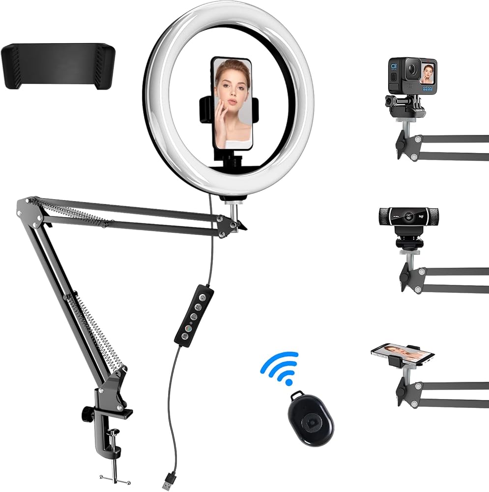 ضوء حلقة سيلفي 10 بوصة مع كاميرا علوية وحامل هاتف، ضوء حلقة سطح المكتب مع جهاز تحكم عن بعد لهاتف iPhone، مناسب لتسجيل الفيديو، اجتماعات التكبير، البث المباشر، TikTok، YouTube