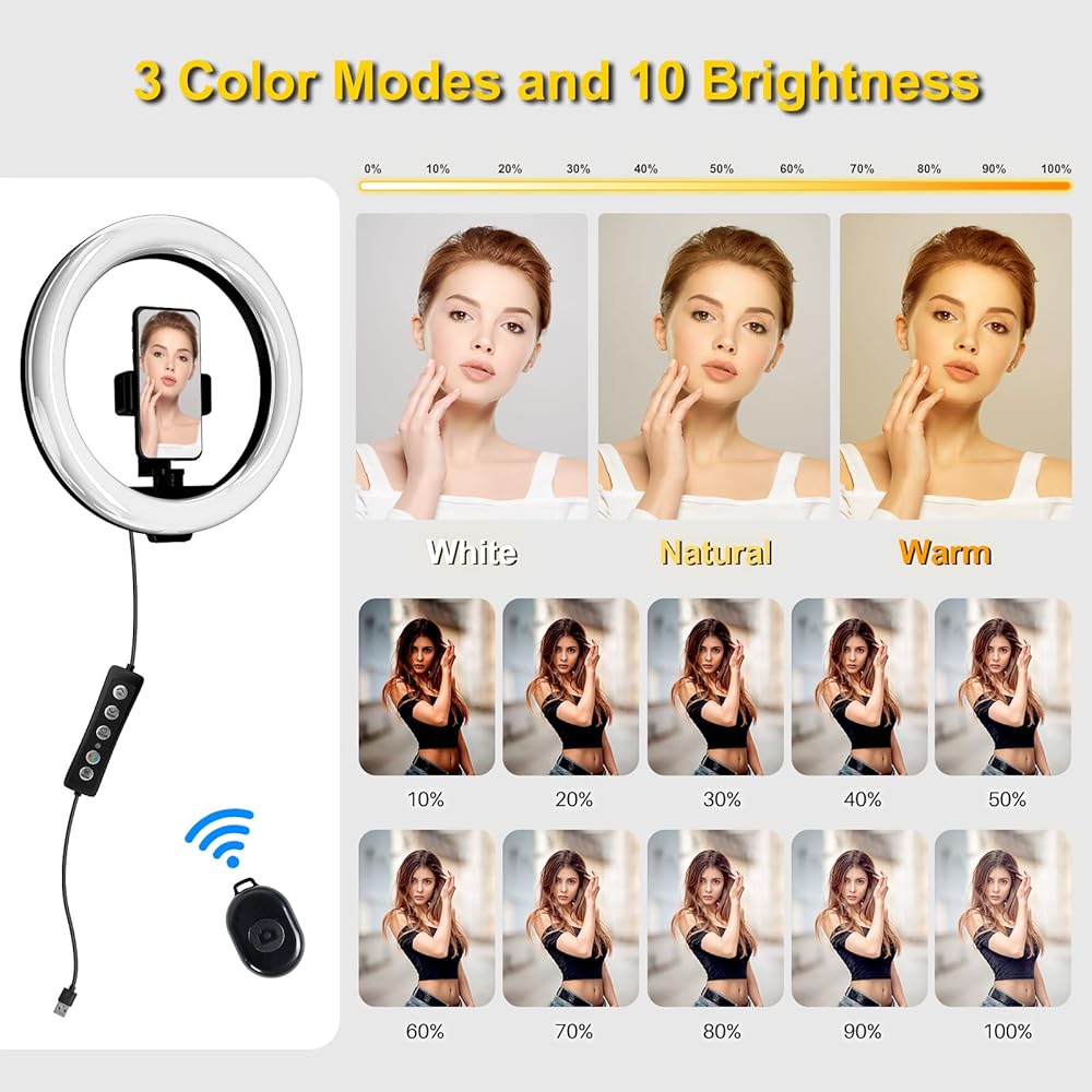 【3 أوضاع ألوان و10 مستويات من السطوع】يأتي هذا الضوء الحلقي مع حامل هاتف يمكنه بسهولة ضبط 3 أوضاع ألوان (دافئ، بارد، وطبيعي)، كل وضع له 10 مستويات من السطوع. يمكنك بسهولة ضبط لون وسطوع الضوء وفقًا لمحتوى التصوير. مناسب جدًا للمصورين ومستخدمي YouTube ومدوني الفيديو وTikTokers وغيرهم.