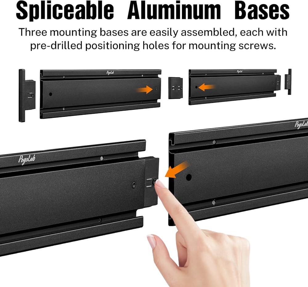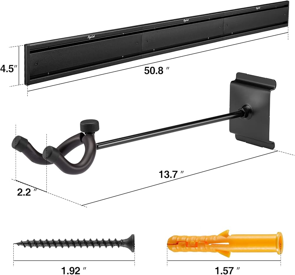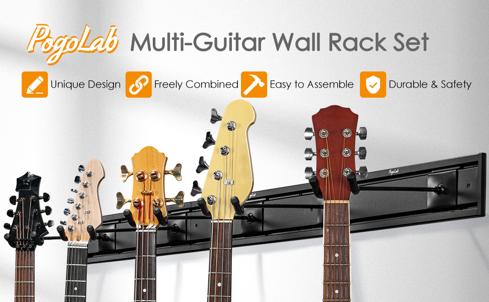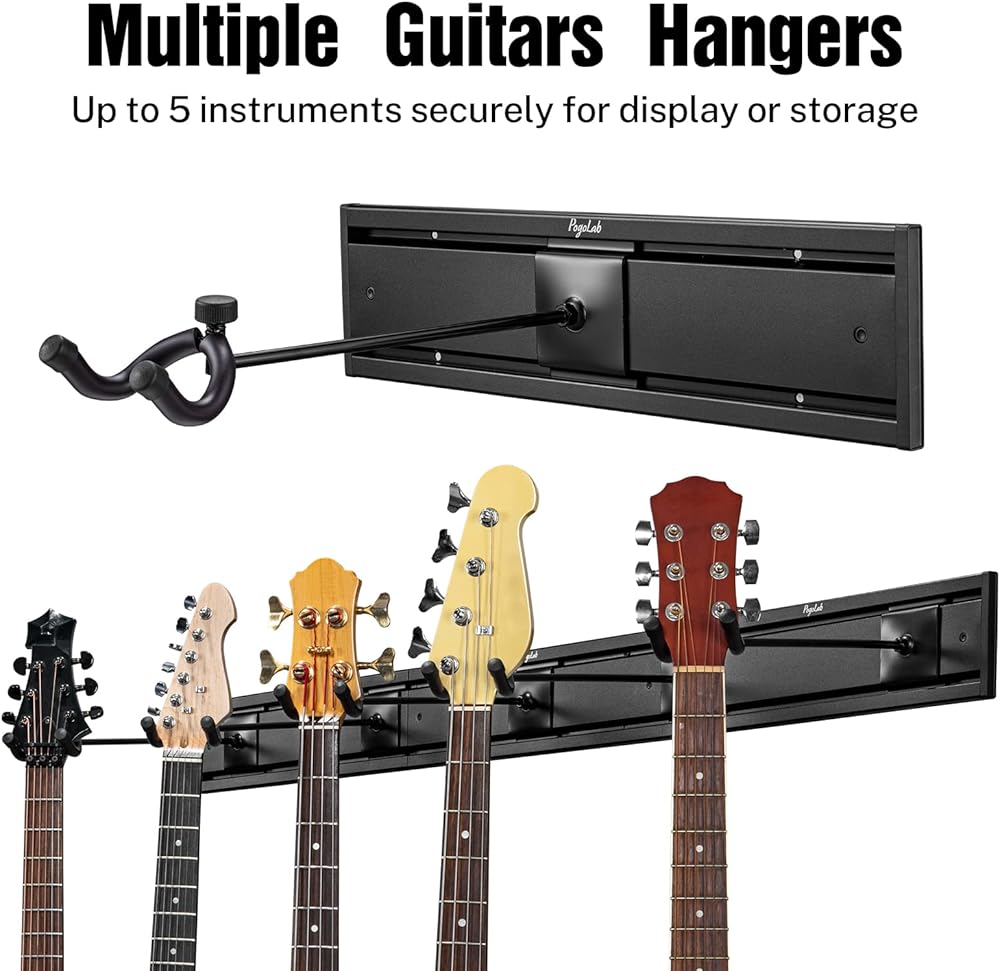 [حل آمن ومأمون لتخزين الجيتار] يوفر حامل جدار الجيتار Pogolab طريقة آمنة ومأمونة لتخزين القيثارات الخاصة بك. يتميز بمسار جداري مضلع متين مقاس 50 بوصة مع سعة تحميل عالية وإطار من الألومنيوم، بالإضافة إلى 5 شماعات فولاذية قابلة للتعديل، يمكنك تخزين العديد من الجيتارات بثقة.