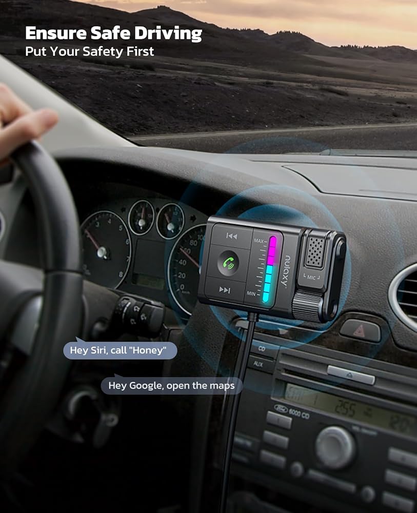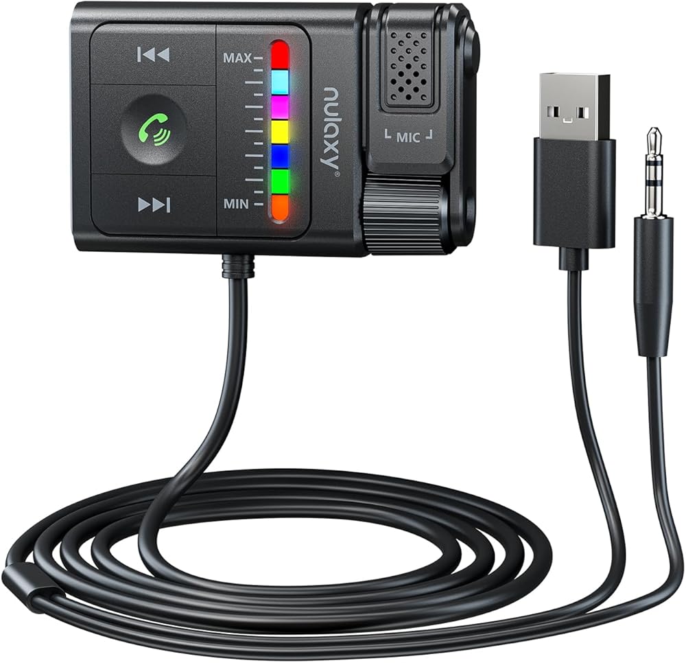 • Unique Lighting Effects: Our bluetooth car adapter aux input features a 7-color changing LED light that not only helps you locate buttons more easily at night, making driving safer, but also syncs with volume or bass adjustments, allowing you to clearly perceive whether the operation is correct.