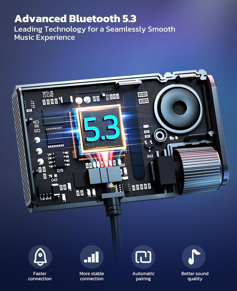 • Crystal-Clear Stereo Sound: This AUX to Bluetooth car adapter features the latest Bluetooth 5.3 technology for faster, more stable connections up to 30m range, delivering clearer, superior stereo sound. Enhance your driving experience with more fun and color.