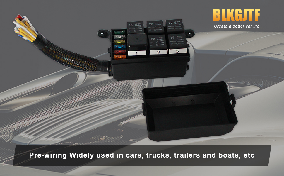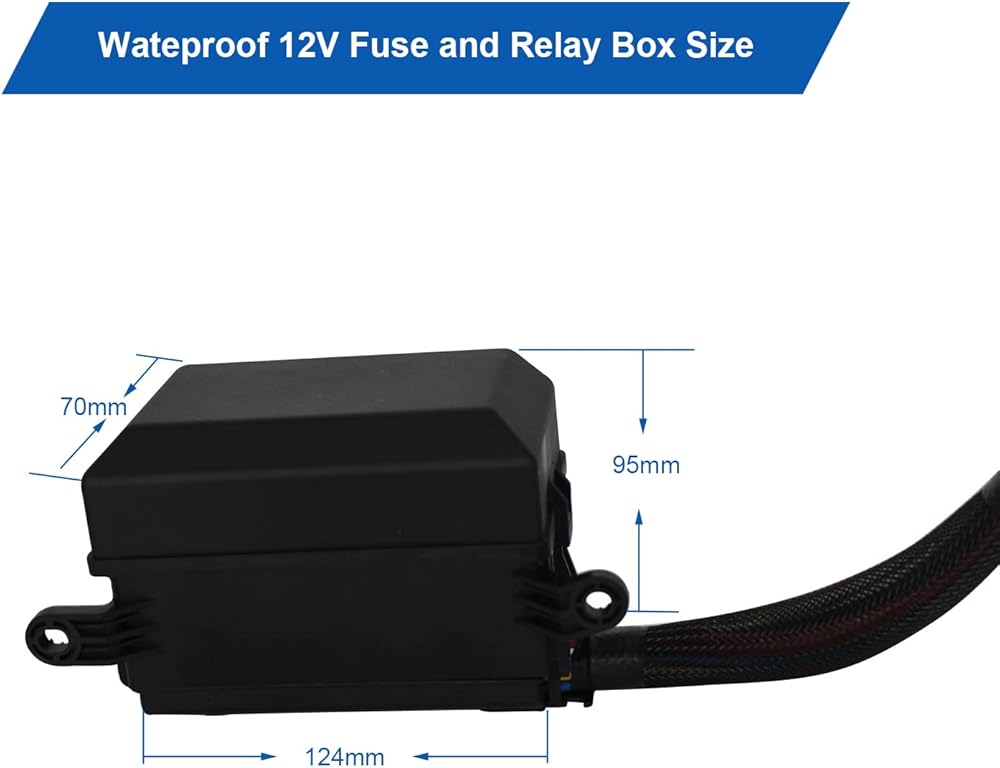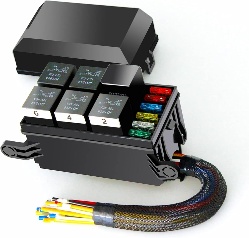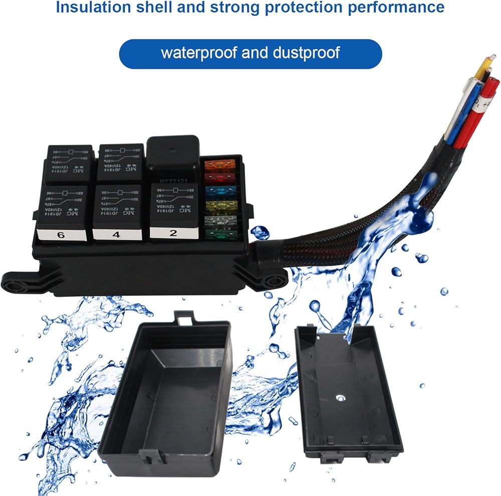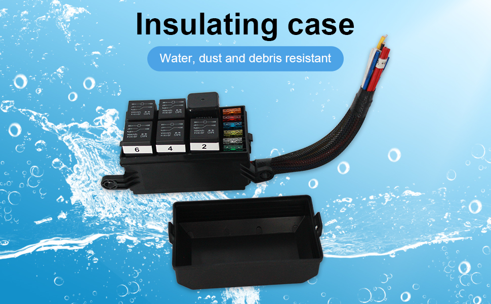 صندوق التتابع: يحتوي صندوق صمامات ترحيل السيارات على صندوق ثابت ذو سعة كبيرة، مجهز بخمسة مرحلات JD1914 12V 40A ذات 5 دبابيس وواحد RTT7121 12V 40A ذو 4 دبابيس، و6 صمامات شفرة ATC/ATO 5A، 10A، 15A، 20A ، 25A، 30A، صندوق الصمامات التتابعي يمكن أن يلبي أنواعًا مختلفة من الاحتياجات، مناسب لجميع القوارب، RVs، السيارات، إلخ.