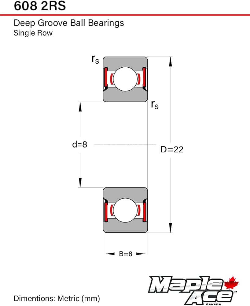 608-RS Ball Bearing dimensions: Bore Diameter 8mm, Outside Diameter 22mm, Width 7mm. 100% Chrome Steel. This unique bearing design features six larger diameter balls instead of the seven balls used in most 608 bearings. The advantage of this design is higher speed, greater strength and durability. Polyamide PA66 cage ball retainer for greater strength and High Speed.