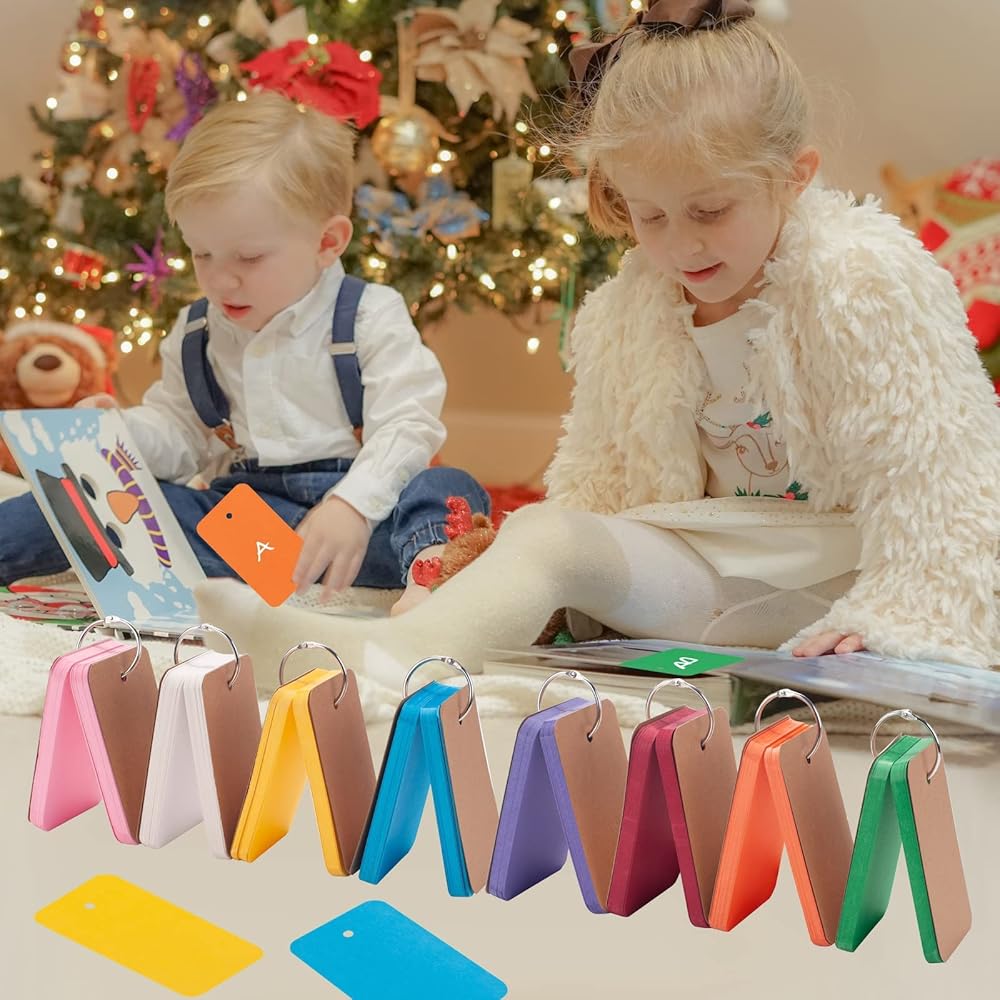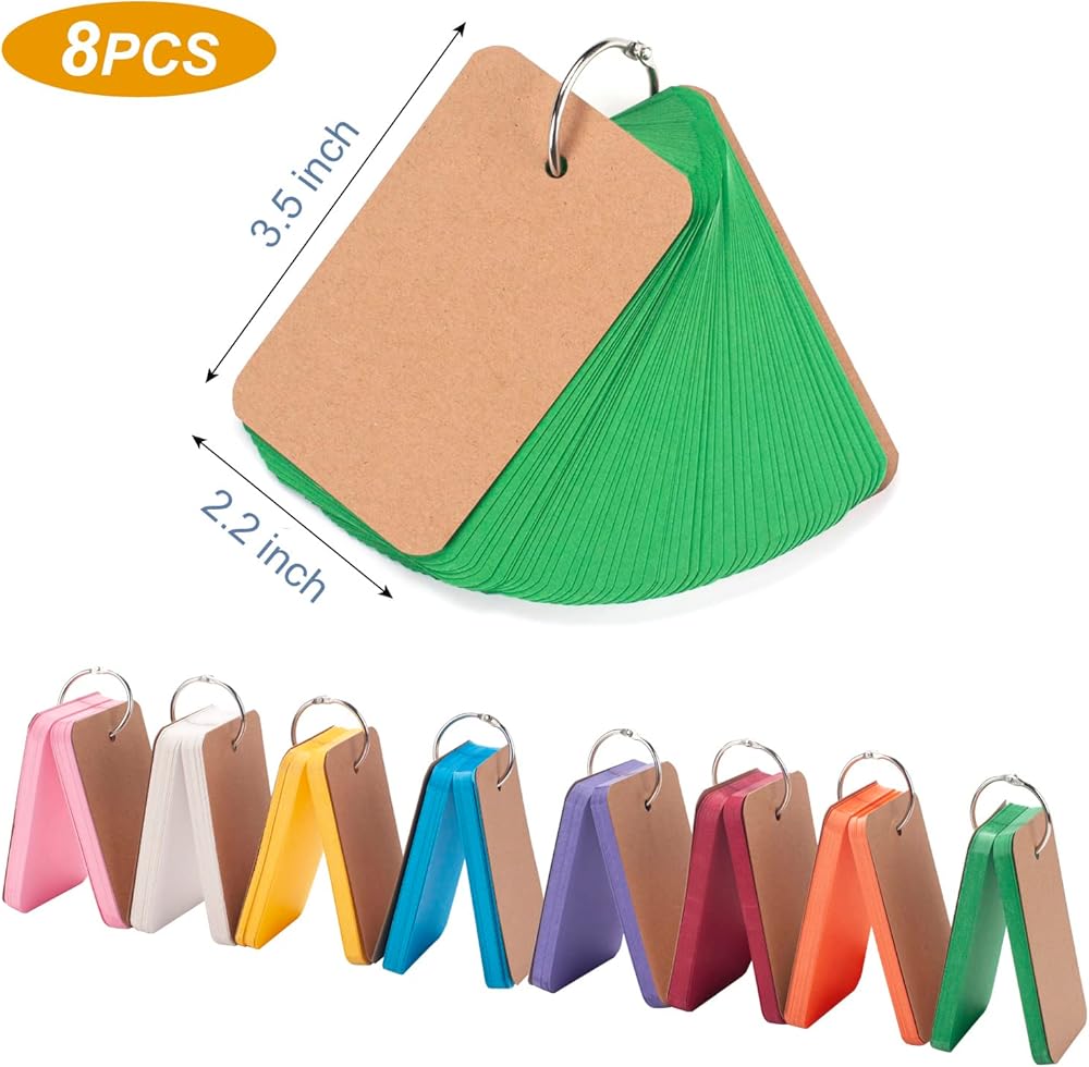 • تشمل العبوة - 8 مجموعات من بطاقات الفلاش الفارغة مع 8 حلقات تثبيت، تأتي في 8 ألوان مختلفة (أخضر فاتح، أزرق، وردي، أحمر، أرجواني، أصفر، أبيض، أزرق داكن)، 50 قطعة لكل لون.