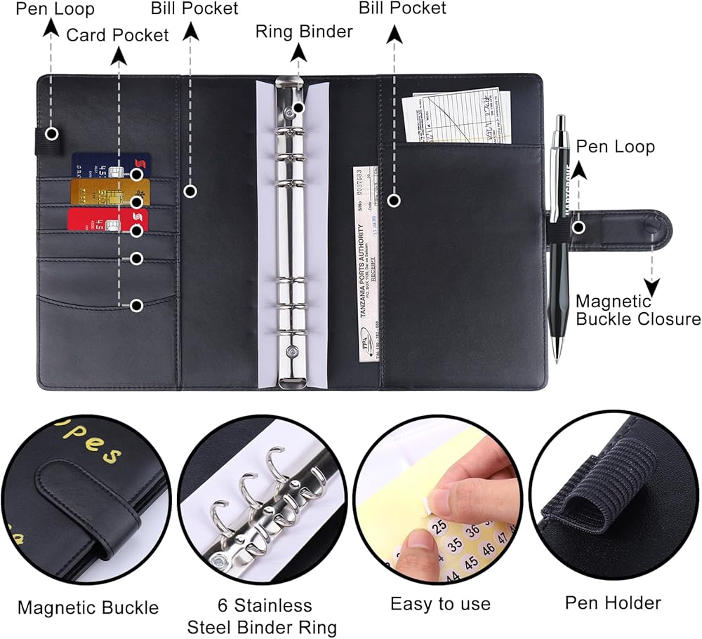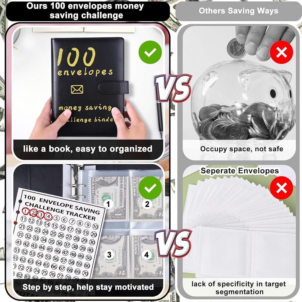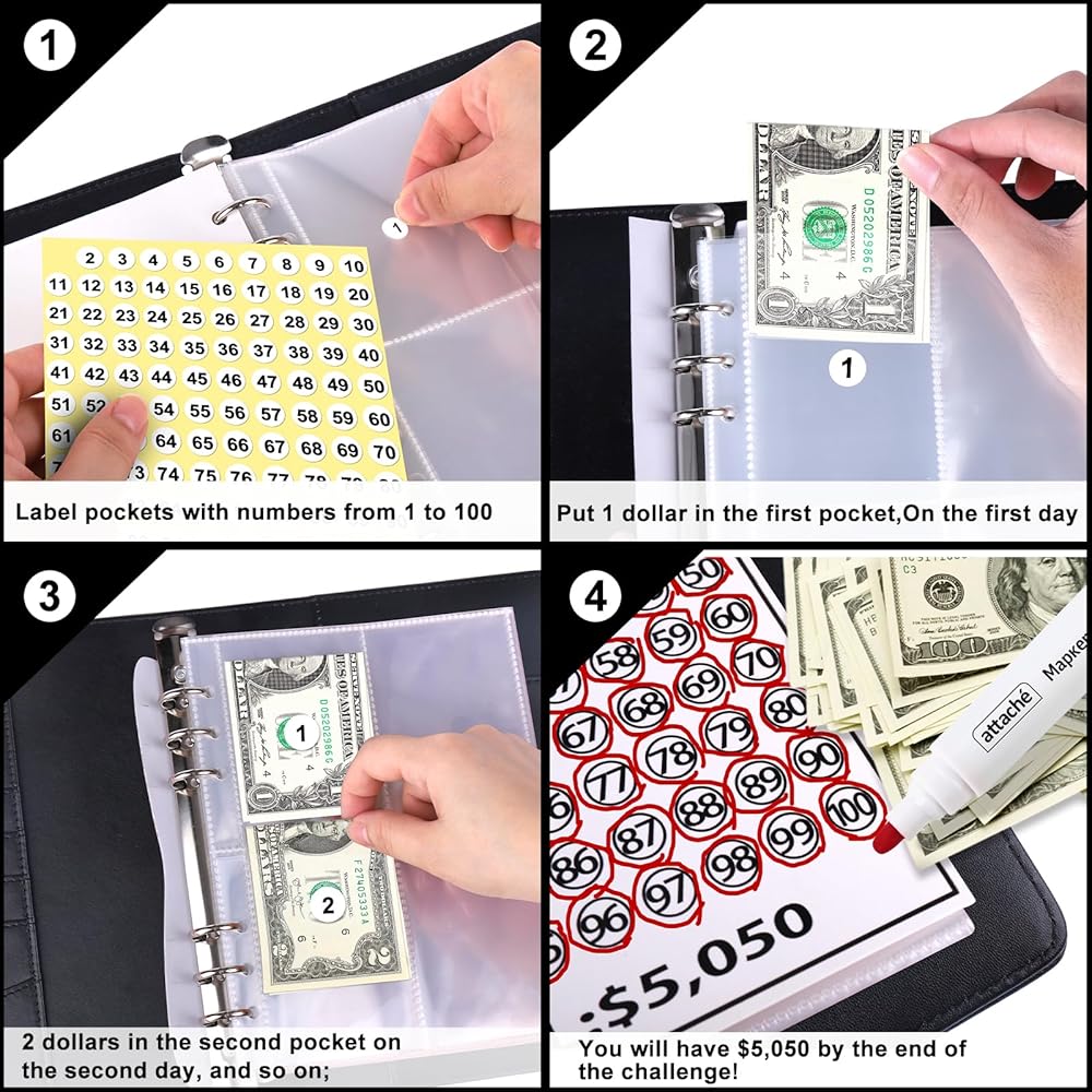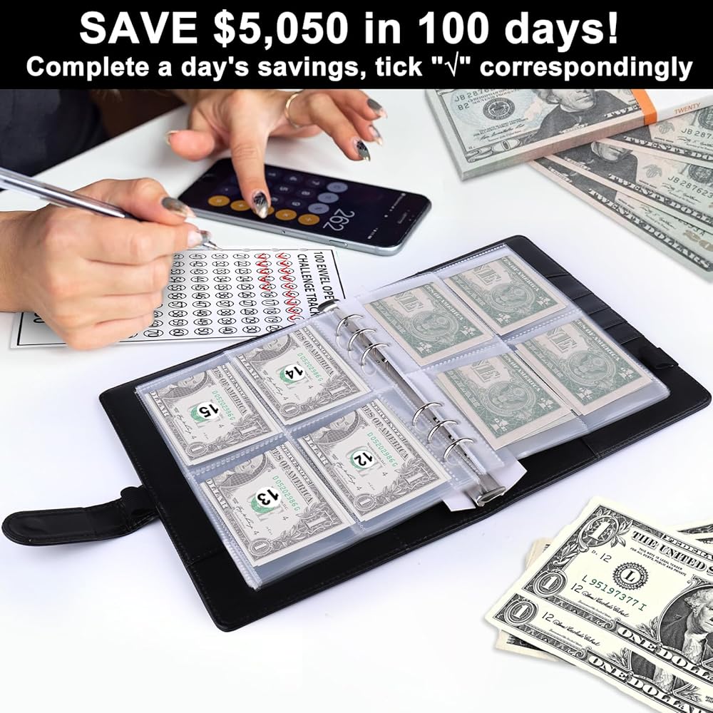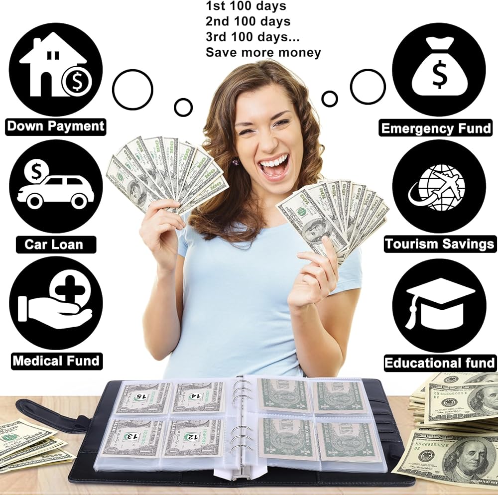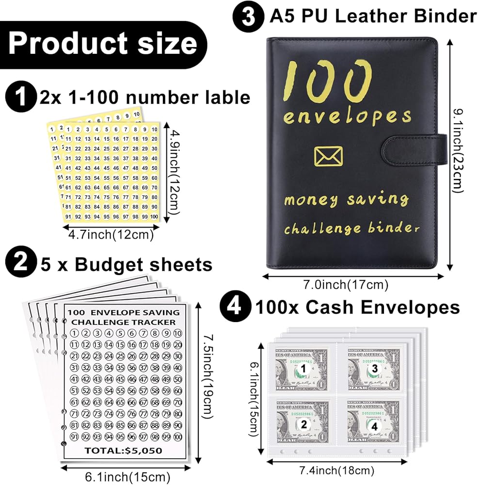 AIERSA 100 مغلف، مجموعة أدوات تحدي توفير المال، منظم كتب ممتع للميزانية مع مظاريف نقدية لحشو النقود لمدة 100 يوم، الميزانية، استبدال صندوق توفير المال، أسود