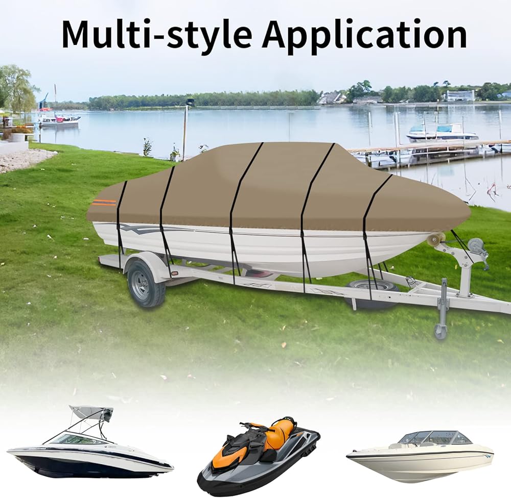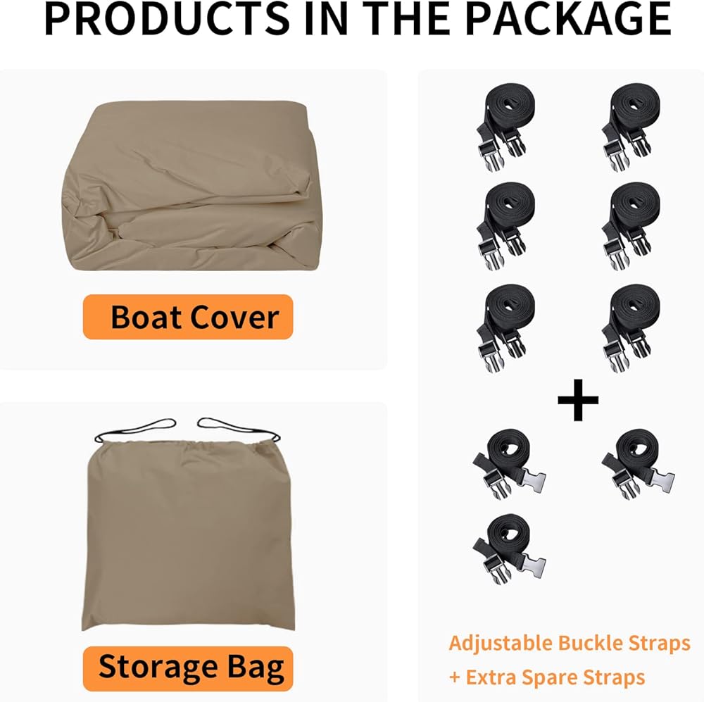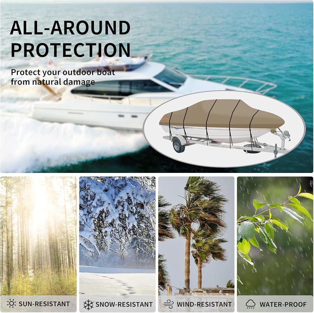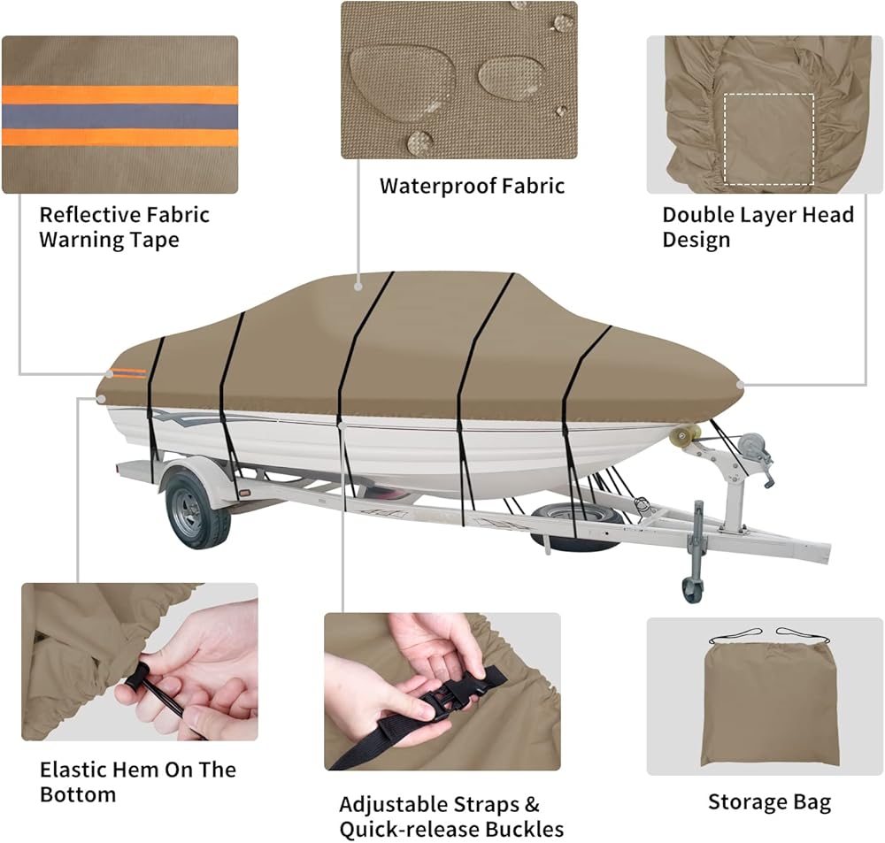 • 100% Waterproof: Our durable boat covers are all added UV-stabilized and Waterproof coating with a waterproof laminated backing, and tape sealed seam. Three-Layers of Protection could prevent water from seeping through cover on rainy days to keep your boat dry, clean and safe.
