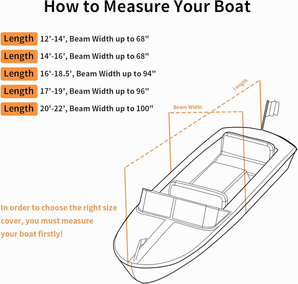 • Size: This boat cover fits up to 20-22 Ft Long X 100" Wide. Please measure your boat before purchasing. Multiple size options are available to fit the different styles and brands of boats.