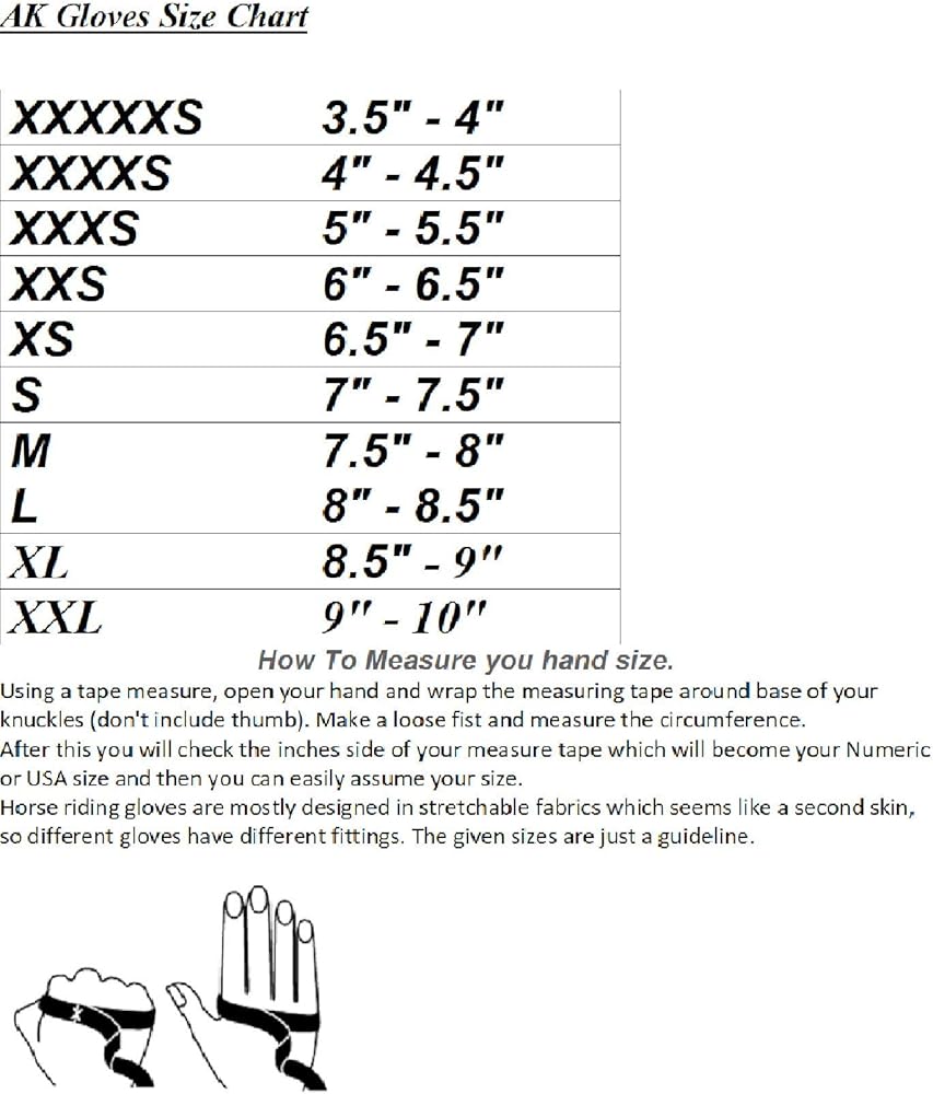 AK Synthetic Grip Horse Riding Gloves All Season Unisex Equestrian Gloves AK Embossed synthetic grip, all season glove, very soft and having comfortable feel, reinforced patches in between fingers for extra rein grip, nice cut, elegant zig zag stitching on back of hand in different steps by ensuring the secure fitting of hand, adjustable Velcro closure for easy on and off and securing the wrist, thanks to AK designer for good looking PU piping with contrast color for elegant look with metal logo on wrist, Colors: Black, White, Black/White, Navy/Silver, Brown/Gold Machine Washable at 30 degree. Instruction: Machine Washable at 30 degree.