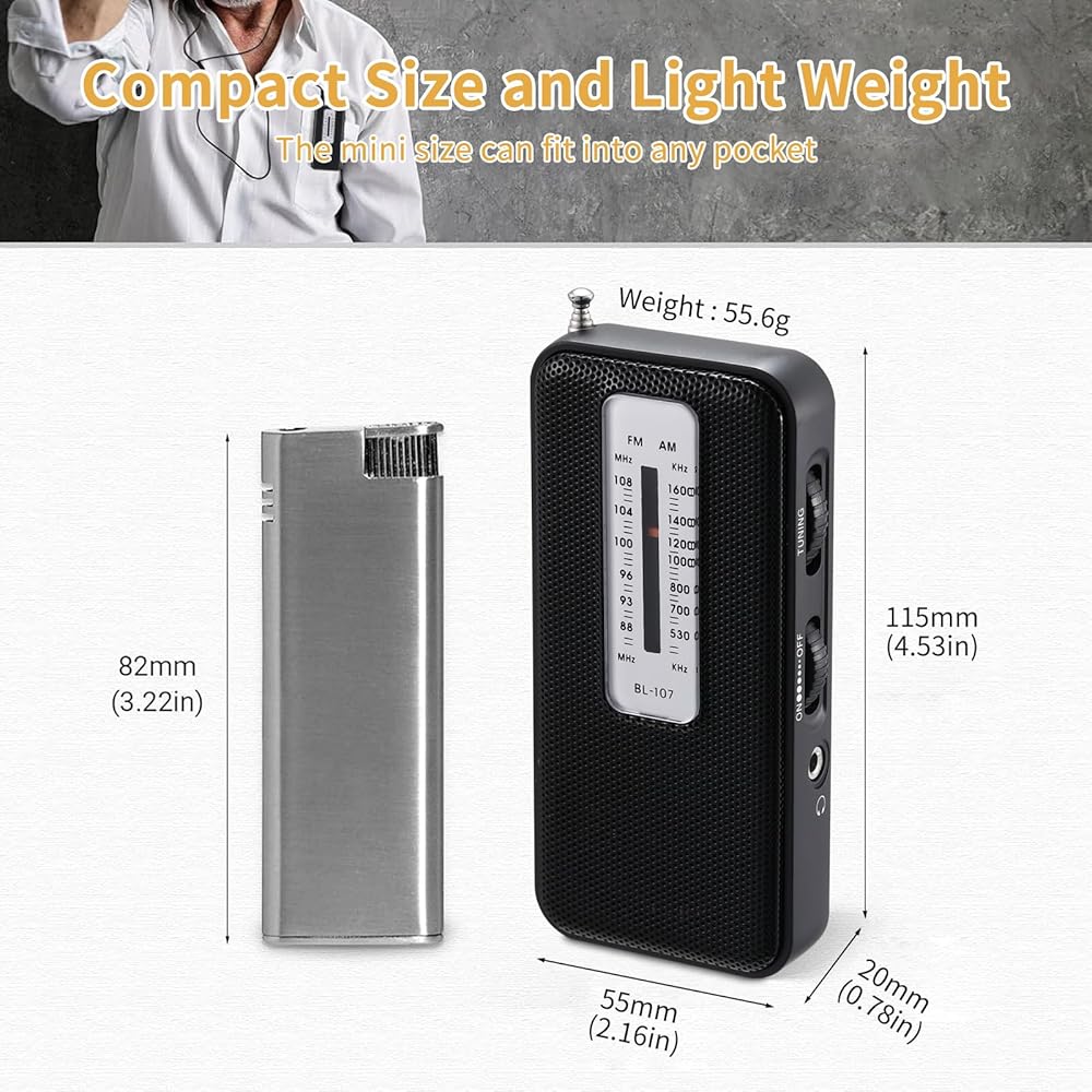 راديو صغير الحجم مع سلسلة يدوية: يبلغ قياس راديو الجيب الصغير والبسيط هذا 2.16 × 0.78 × 4.53 بوصة فقط ويزن 0.12 رطل فقط (البطاريات غير متضمنة). إنه بحجم ولاعة Bic تقريبًا ويمكن وضعه بسهولة في أي جيب. نظرًا لصغر حجمه، فهو الخيار الأمثل للخروج للمشي والركض والجري والتخييم.