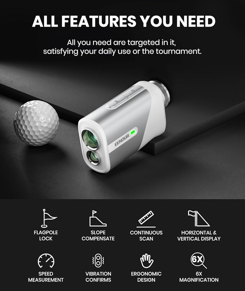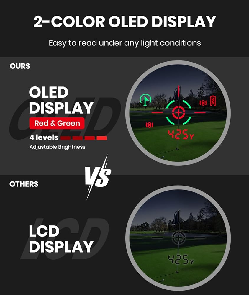 【قياس عالي الدقة】مجهزة بتكبير 6x، تتميز أجهزة تحديد المدى للجولف لدينا بمدى يتراوح من 5 إلى 1093 ياردة بدقة +/- 0.5 ياردة وحتى قياس كل من الياردات والأمتار. اضغط على الزر وسيتم عرض القياس خلال 0.064 ثانية. والتي تضمن قراءة واضحة وسريعة.