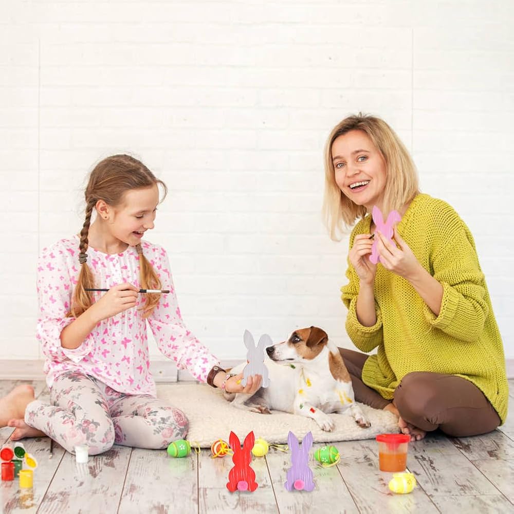 ذيول بومبوم تفاعلية: أضف متعة عملية مع ذيول بومبوم التفاعلية! يأتي كل أرنب خشبي لعيد الفصح مع ذيل بوم بوم يمكنك ربطه بالأرنب بنفسك، مما يجعله نشاطًا جذابًا. يتم تضمين أربع كرات ملونة وست نقاط لاصقة لإضفاء لمسة مرحة وتجربة صنع الأمنيات.
