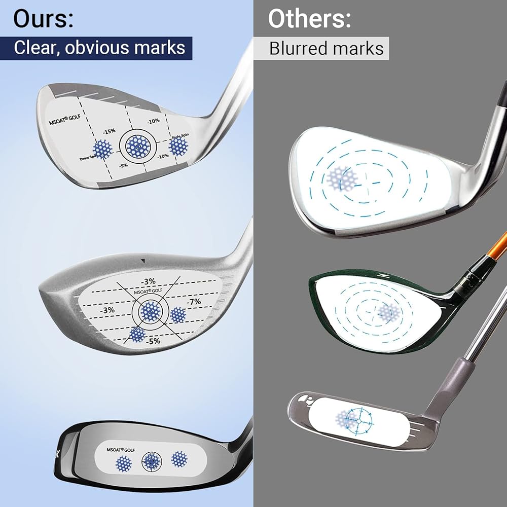 ⛳ العلامات الزرقاء للتعليقات الفورية: شريط تأثير الجولف مصنوع من ورق حساس للضغط يتحول إلى اللون الأزرق حيث تضربها الكرة. يوفر شريط التأثير الرفيع لمضرب الجولف علامات زرقاء واضحة ودقيقة دون تغيير التأرجح، مما يبقيك على اطلاع بنتيجة كل ضربة. يمكنك ضبط تأرجحك بناءً على العلامة لتحسين نتائج الضرب ومهارات الجولف المحسنة.