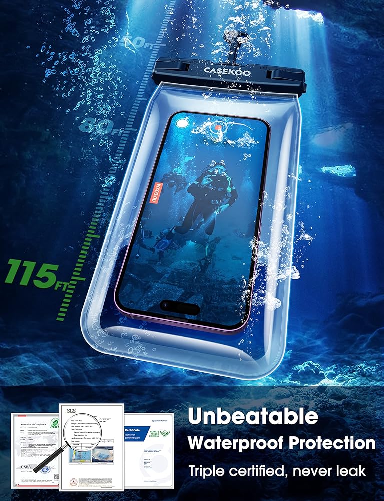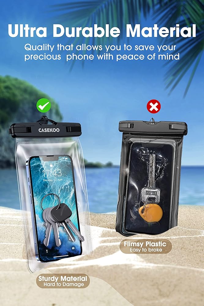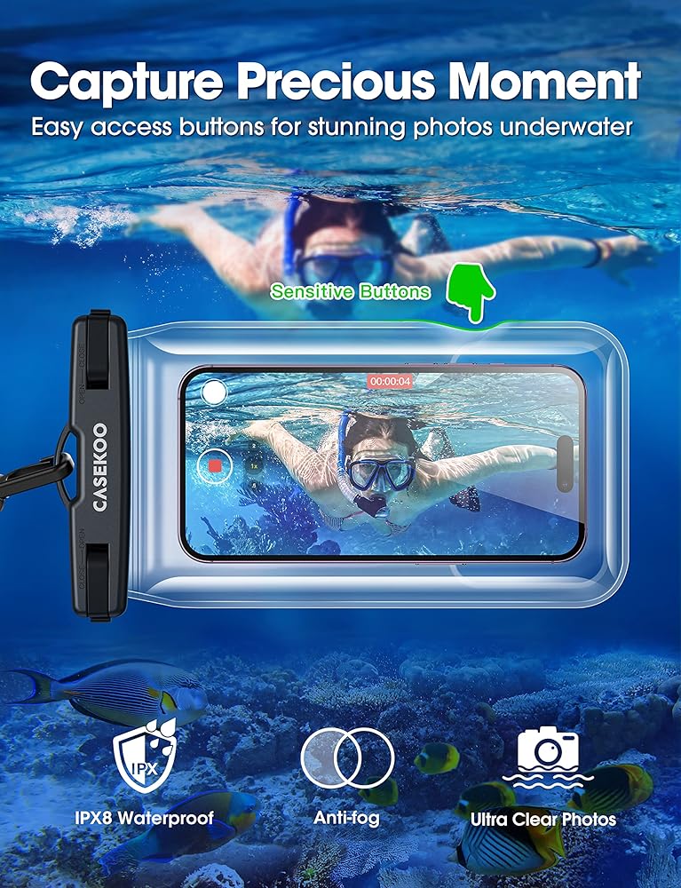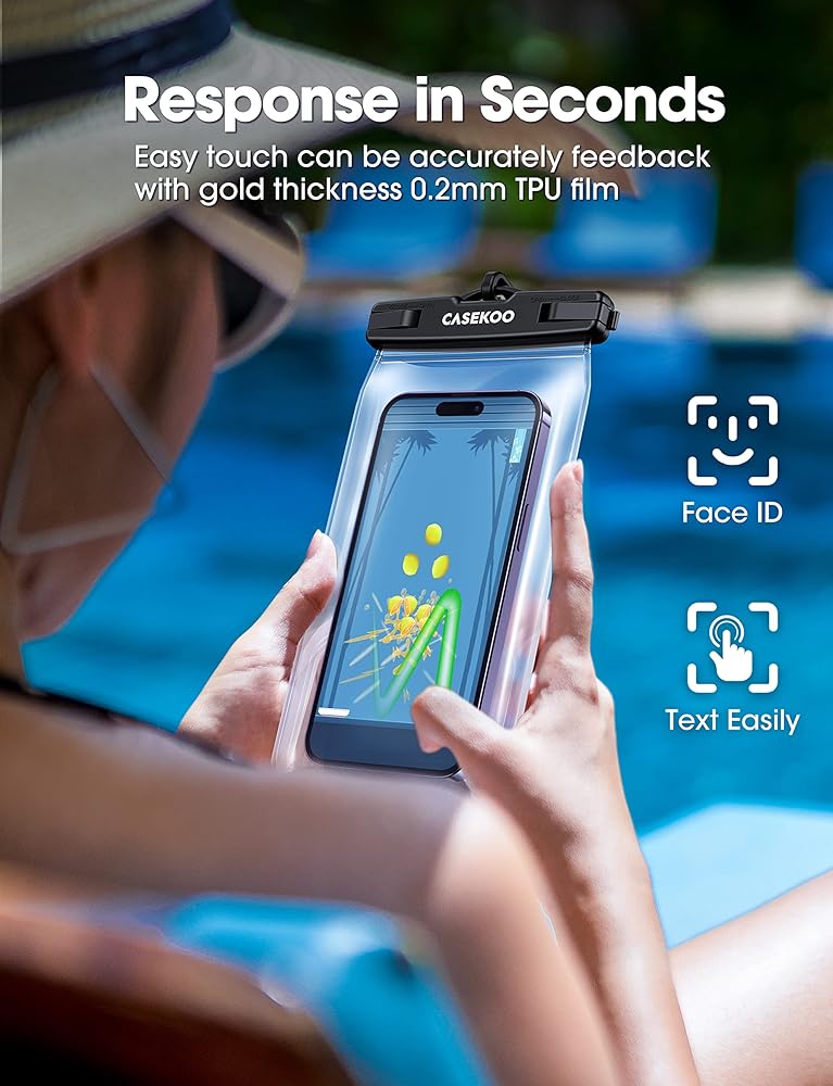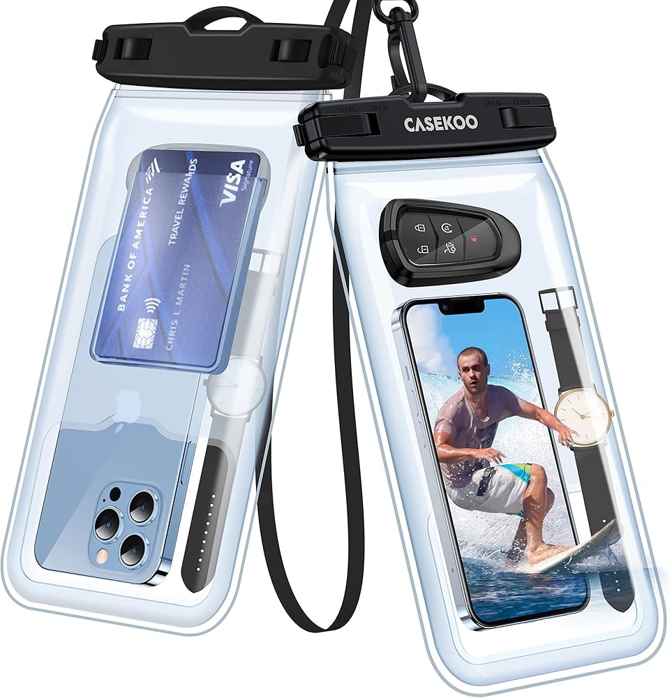 . 𝗲𝗹𝘆】 حافظة الهاتف العائمة المقاومة للماء من CASEKOO حاصلة على تصنيف IPX8 وهي أيضًا حساسة للمس مما يسمح بحماية 115 قدمًا تحت الماء ويسمح لك باستخدام هاتفك كالمعتاد. إكسسوارات الشاطئ للعطلات لا غنى عنها. توفر النافذة الواضحة المصممة في الأمام والخلف رؤية أفضل لالتقاط الصور والتحقق من الرسائل.