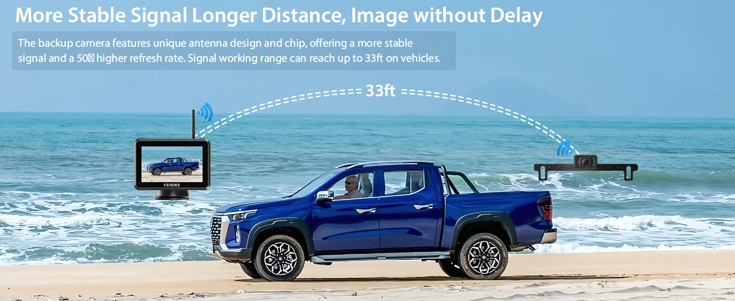 【نقل إشارة ثابت وفي الوقت الحقيقي】تعتمد الكاميرا الاحتياطية اللاسلكية تقنية النقل الرقمي، والتي لن تتداخل مع البلوتوث والواي فاي والراديو والإشارات الأخرى، ويمكنها تقديم صور حقيقية ومستقرة حتى عند السرعة العالية على الطريق. كاميرا احتياطية مع نطاق نقل لاسلكي قوي أقل من 33 قدمًا، مثالية للسيارات متوسطة الحجم مثل الشاحنات وسيارات الدفع الرباعي والشاحنات والمقطورات.