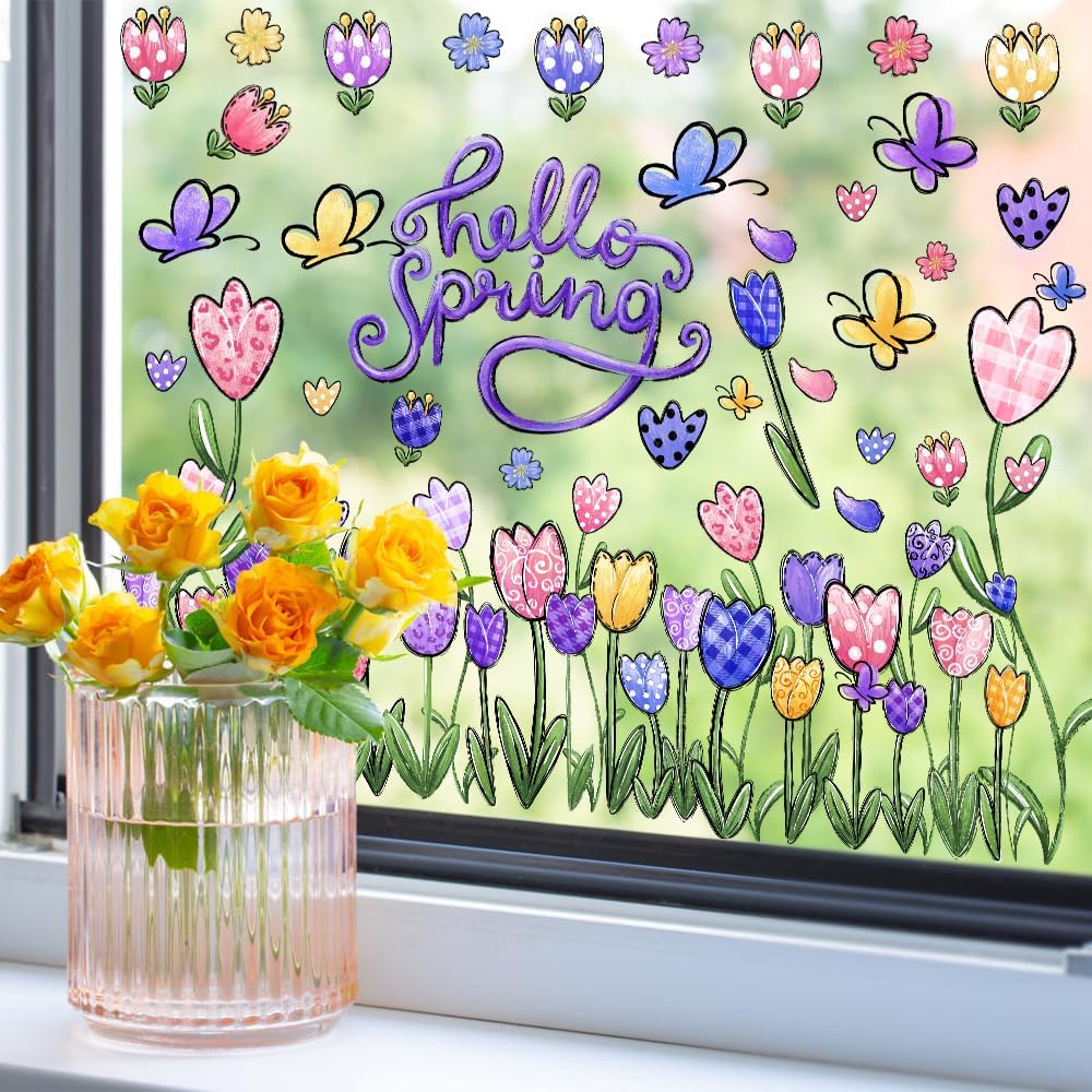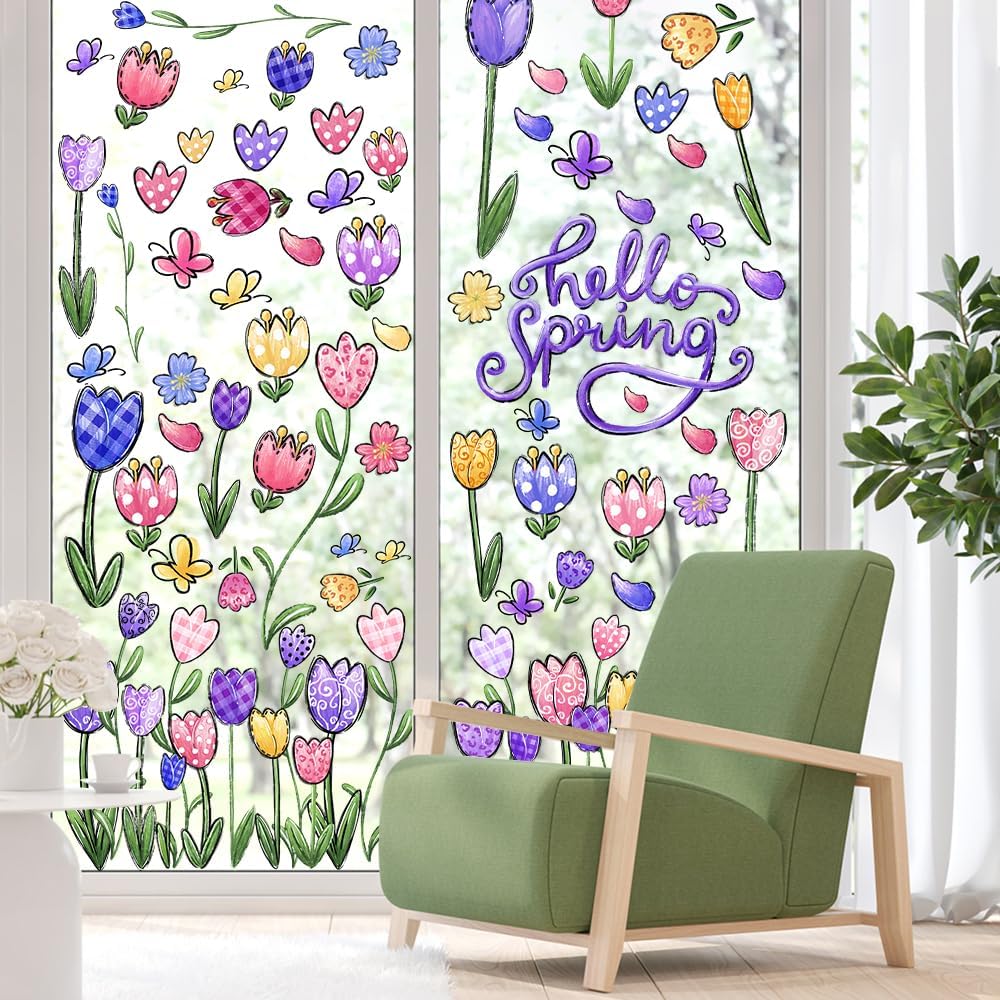 【Oil Painting Style Design】The Flower Window Clings adopt double-sided design, Let you see them indoors and outdoors. It is mainly dominated by Spring oil painting elements, Spots, ripples Tulip etc ,Butterfly, Flowers and the word"Hello, Spring". You can share with your friends or family, DIY decoration together. let It will add some fun to your holiday.