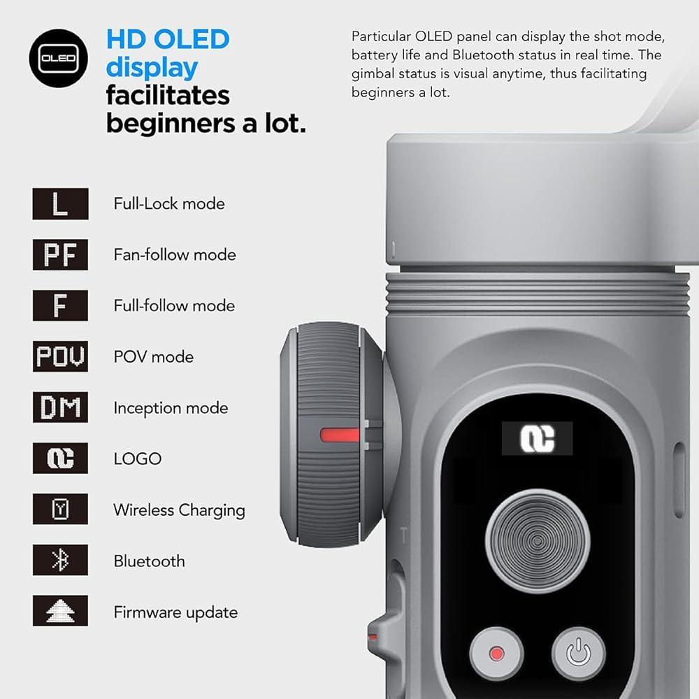 شاشة OLED سريعة الطي، الوزن 310 جرام فقط، ويمكن طيها وتخزينها بسرعة، صغيرة الحجم وخفيفة الوزن، مما يجعل من الممكن السفر بخفة في التصوير الفوتوغرافي في الهواء الطلق؛ يمكن لشاشة OLED الخاصة عرض وضع التصوير، وعمر البطارية في الوقت الفعلي، ويمكن رؤية حالة المحور الثنائي في أي وقت. مريحة للمبتدئين.