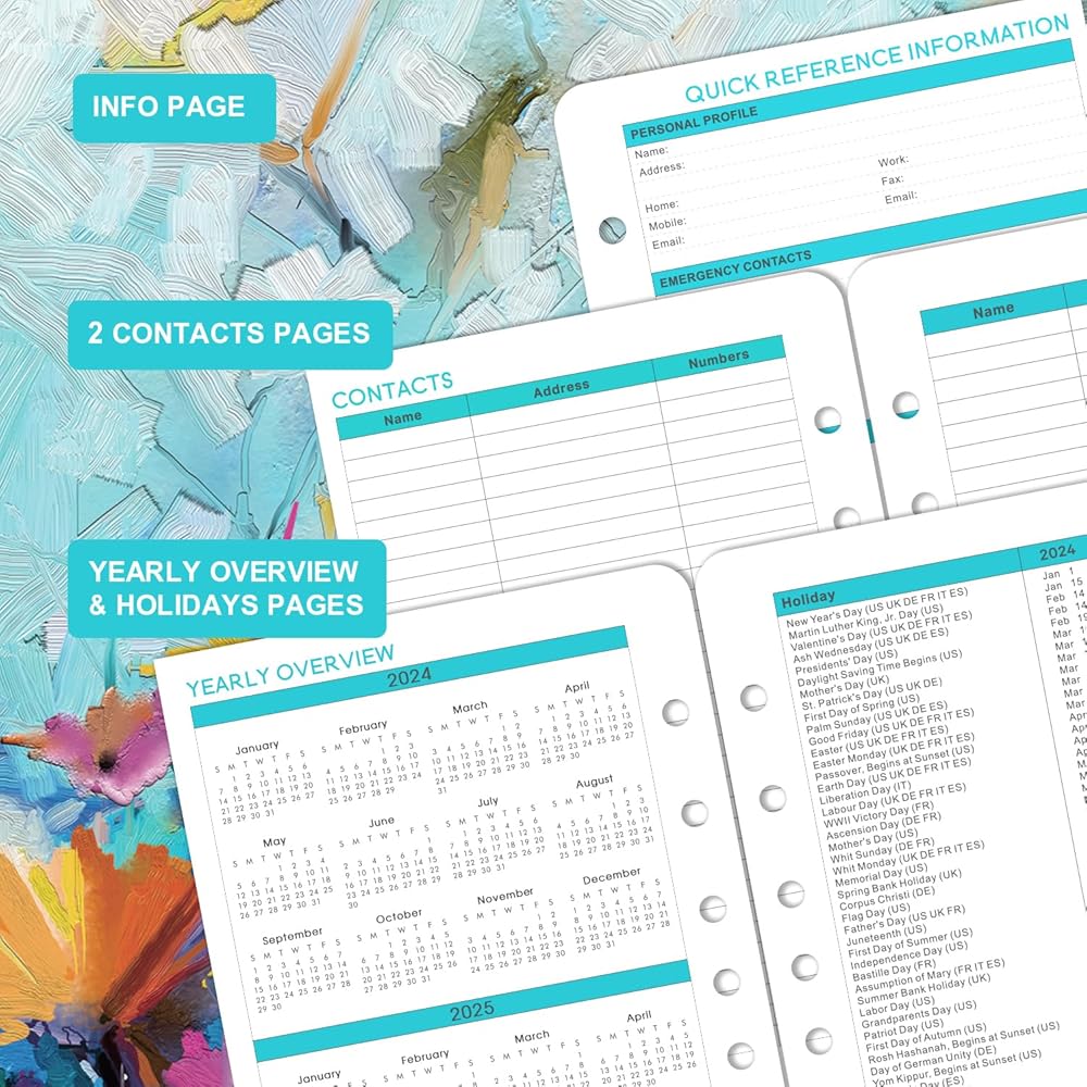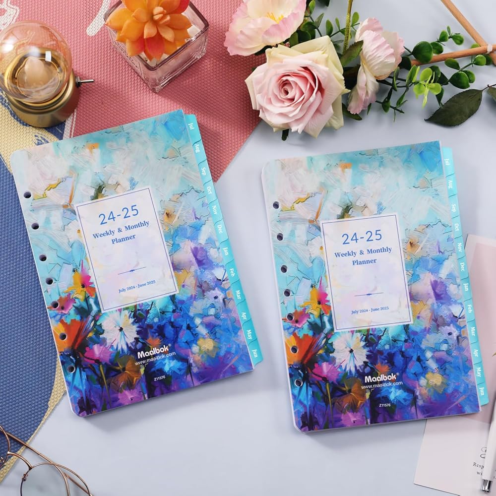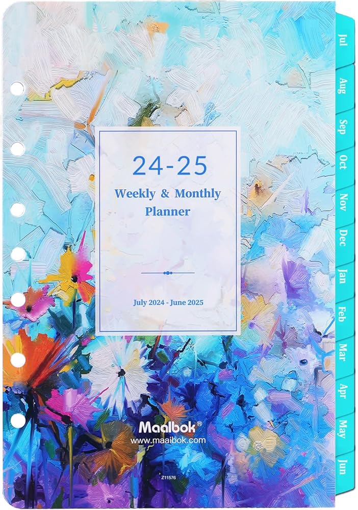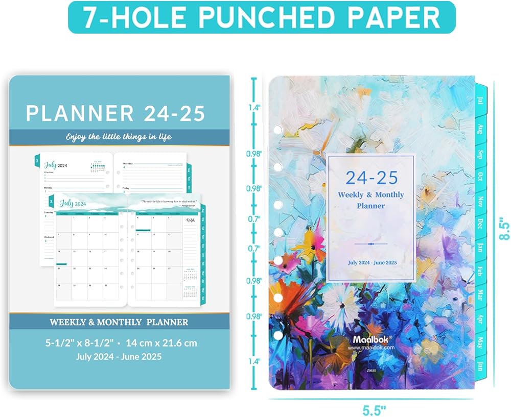 عبوات مخطط 2024-2025 - 7 ثقوب مثقوبة، عبوات مخطط 2024-2025، يوليو 2024 - يونيو 2025، عبوات مخطط أسبوعية وشهرية، عبوات مخطط A5، 5.5 بوصة × 8.5 بوصة، إدراجات مخطط A5