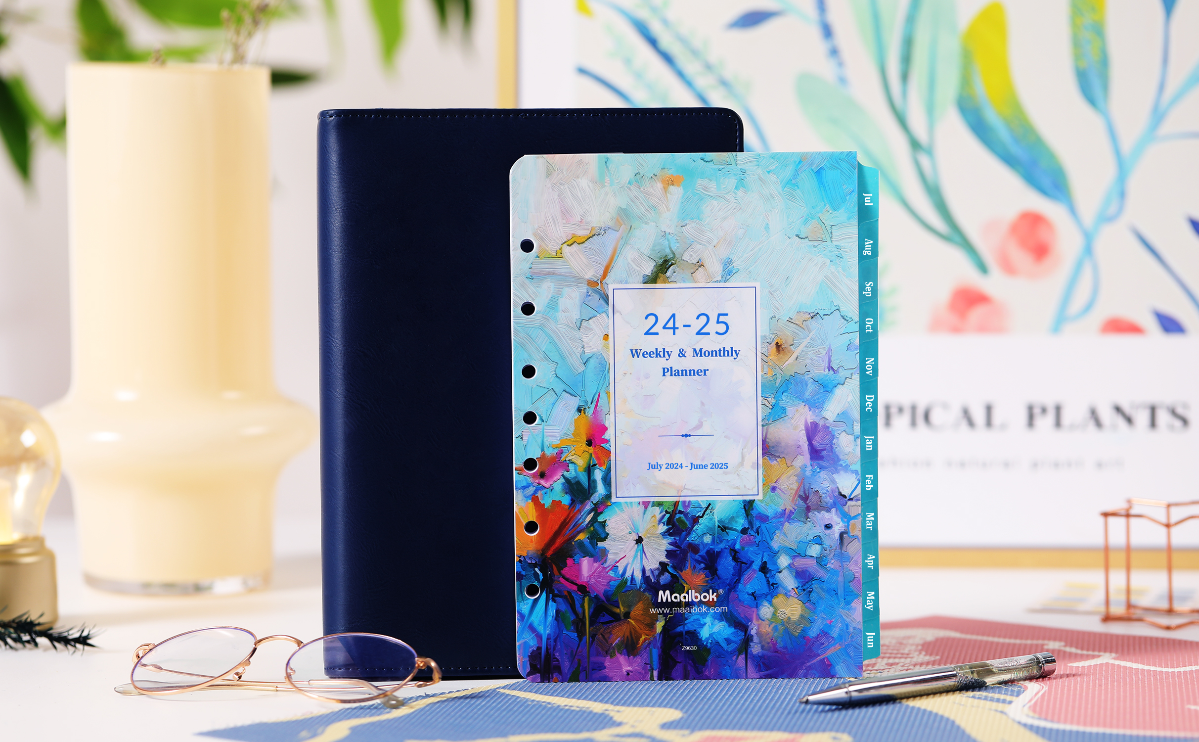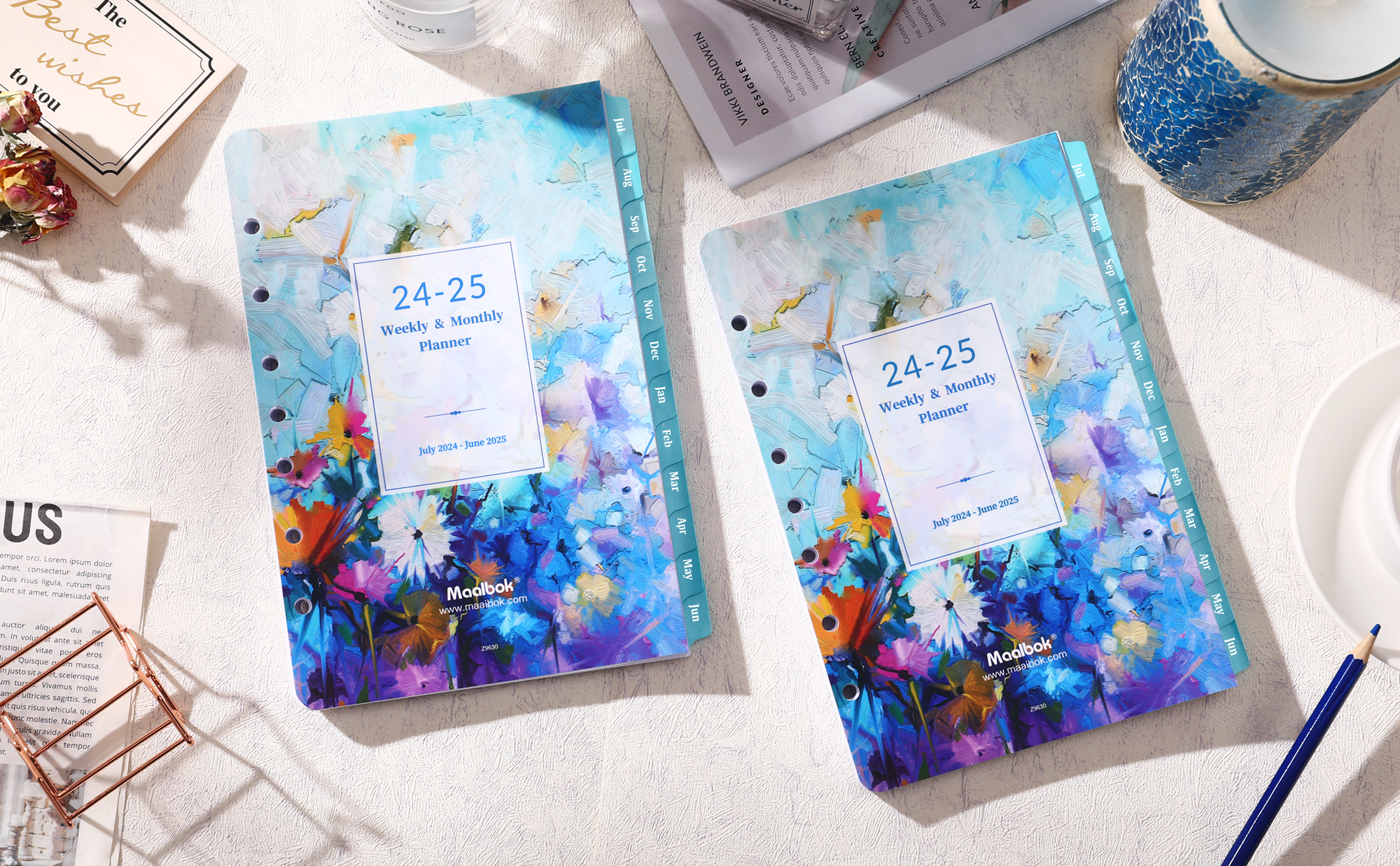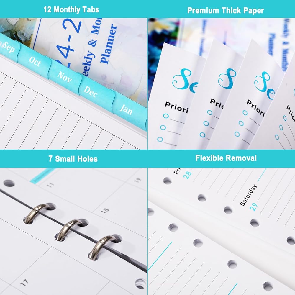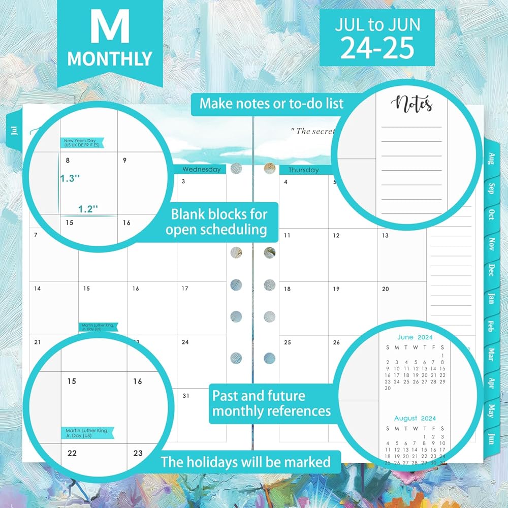 عبوات مخطط 2024-2025 - 7 ثقوب مثقوبة، عبوات مخطط 2024-2025، يوليو 2024 - يونيو 2025، عبوات مخطط أسبوعية وشهرية، عبوات مخطط A5، 5.5 بوصة × 8.5 بوصة، إدراجات مخطط A5
