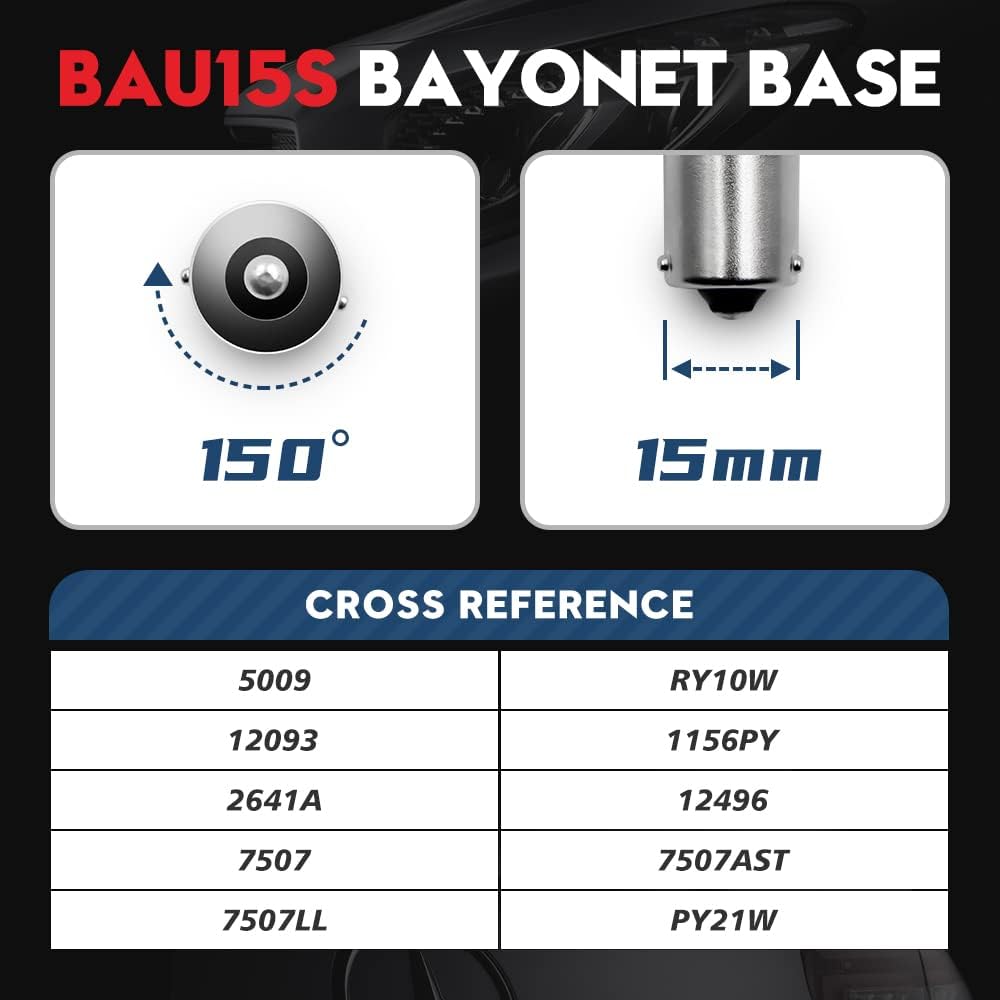 Cross Reference: BAU15S, 1156PY, 2641A, 7507, 7507AST, 7507LL, 12496, PY21W. Please notice that they are NOT APPLICABLE for any mini bulbs such as 5009, RY10W, 12093.