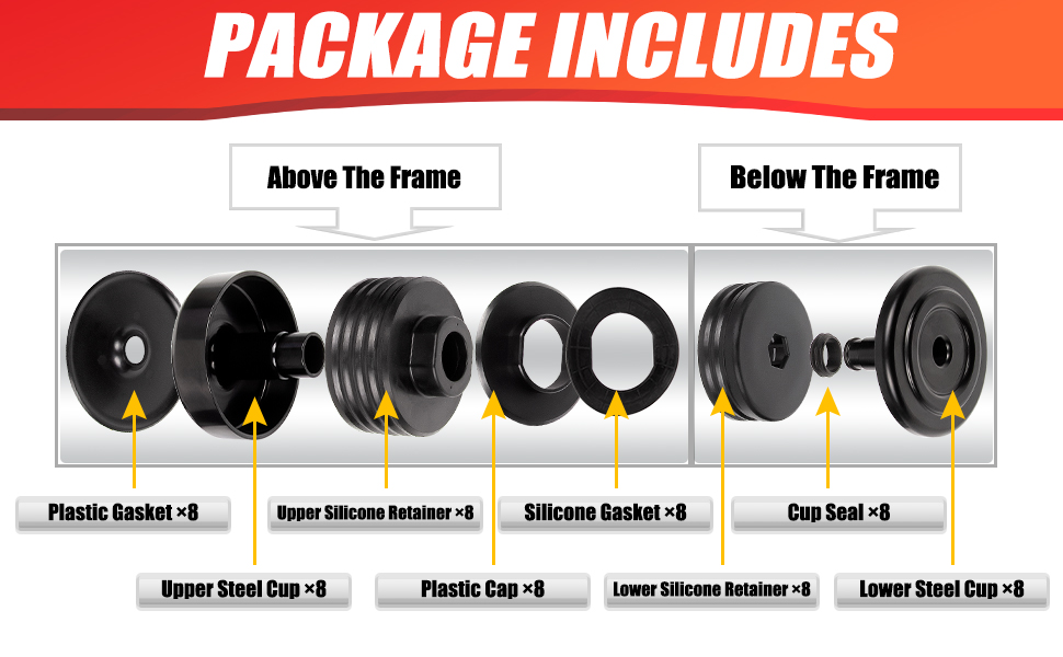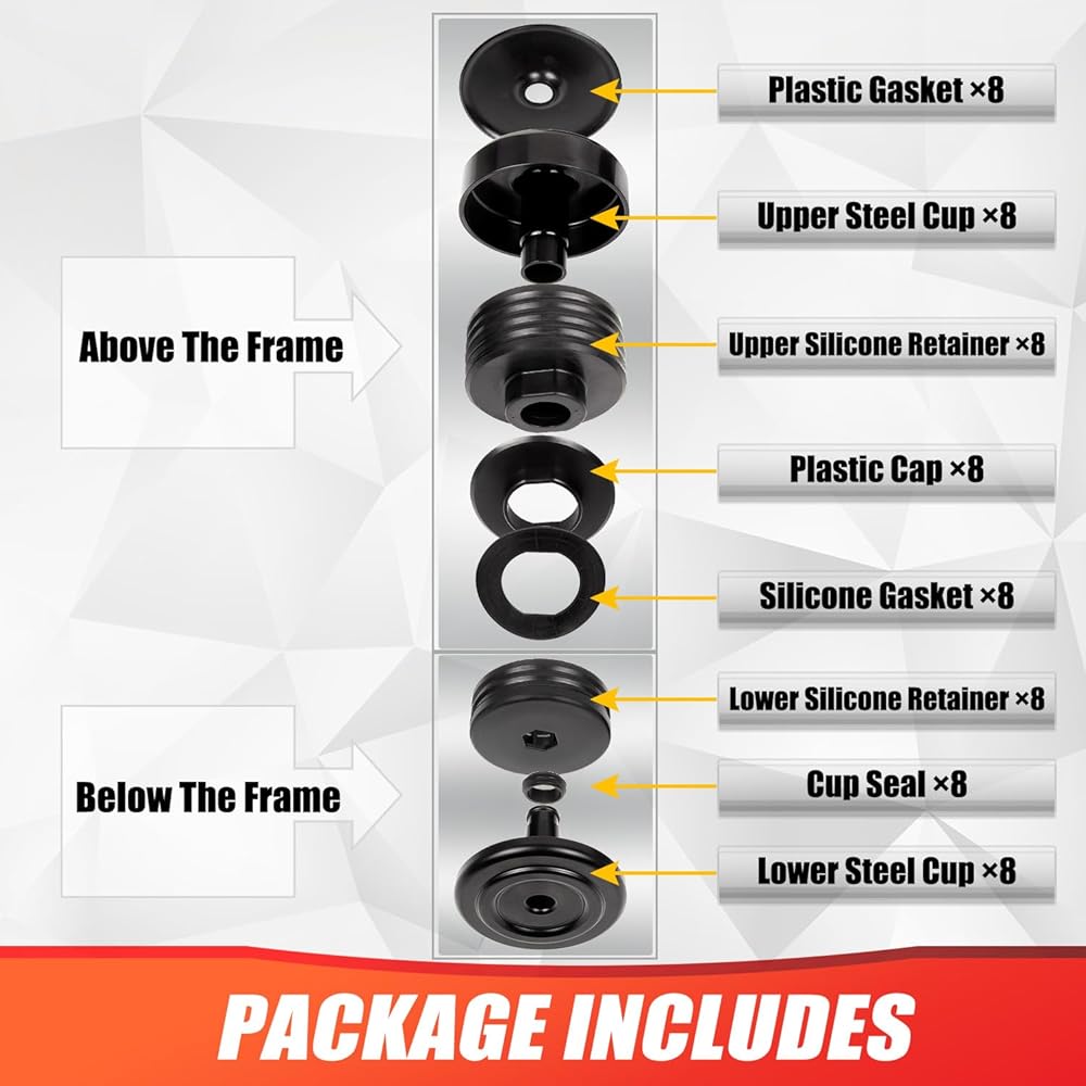 تتضمن الحزمة: 8 * حشية بلاستيكية 8 * كوب فولاذي علوي 8 * مثبت سيليكون علوي 8 * غطاء بلاستيكي 8 * حشية سيليكون 8 * مثبت سيليكون سفلي 8 * ختم كوب 8 * كوب فولاذي سفلي 1 * دليل التعليمات (الترباس غير متضمن)