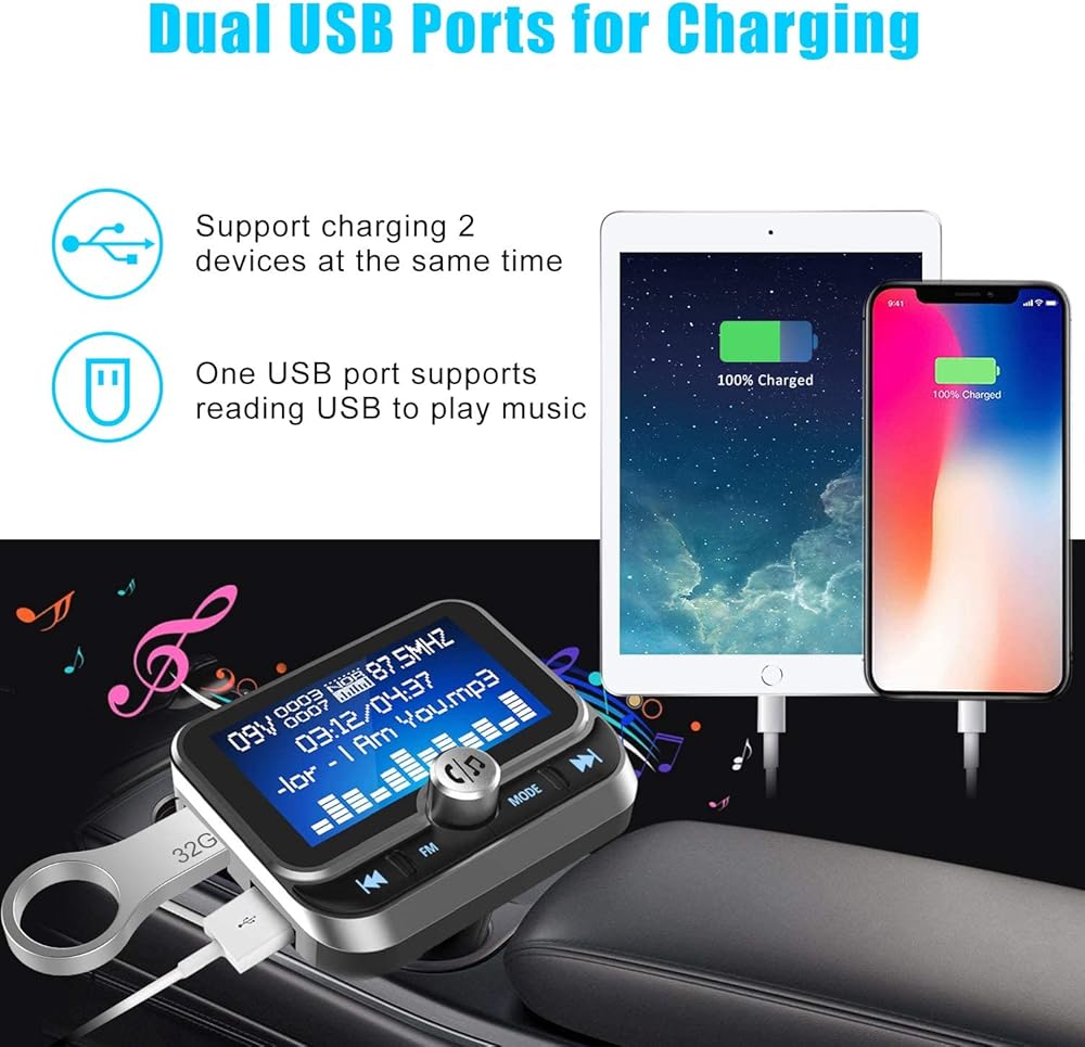 [منافذ USB مزدوجة وشحن سريع]: جهاز إرسال السيارة بلوتوث مع منفذي شحن USB، أحدهما قادر على توصيل قرص U للموسيقى، كما يمكنك شحن أجهزتك بالكامل في وقت قصير، هاتف محمول لاسلكي بدون استخدام اليدين يدعم جهاز الإرسال شحن جهازين في وقت واحد، وهو 3.4 أمبير معًا (5 فولت/ 2.4 أمبير، 5 فولت/ 1 أمبير)، جهاز إرسال FM مع شريحة ذكية مدمجة (شحن IC) سوف يقسم الجهد بناءً على حاجة الجهاز تلقائيًا