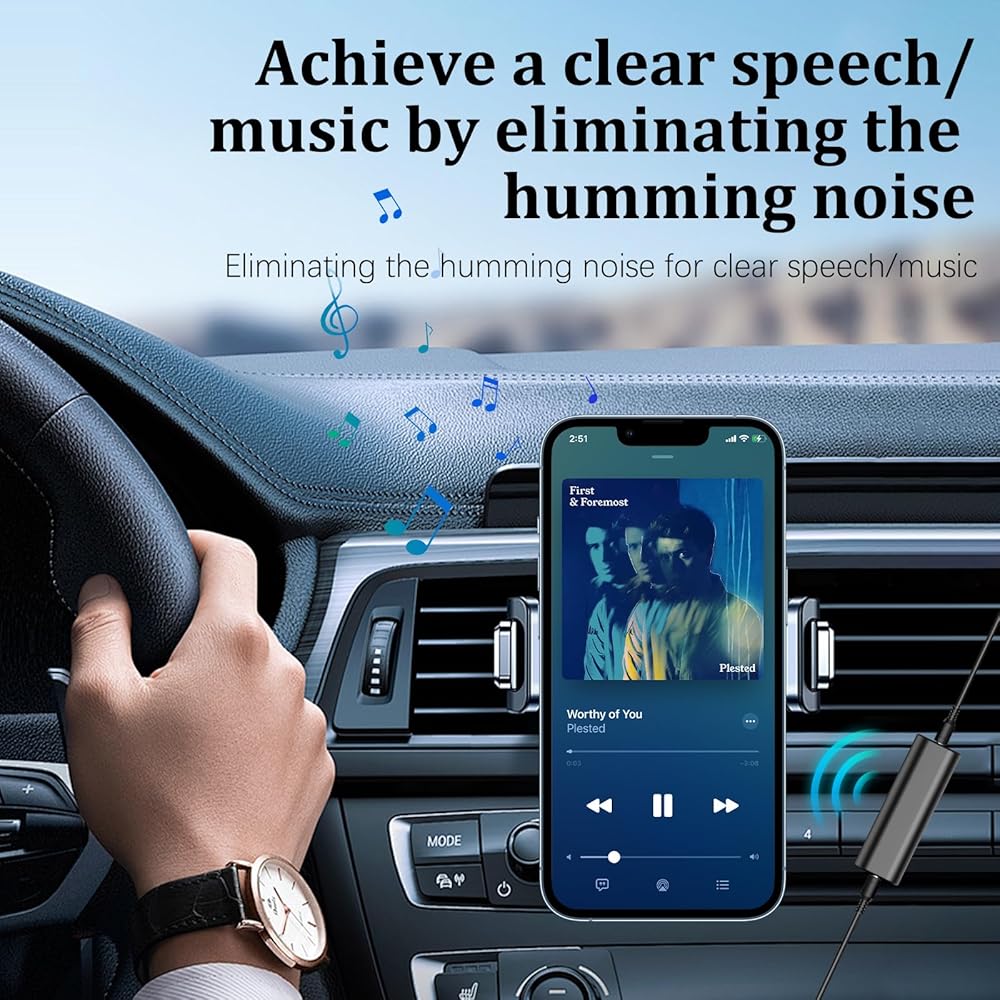 • التوصيل والتشغيل: سهل الاستخدام للغاية - لا يحتاج إلى أدوات، ولا بطارية، ولا أزرار. فقط قم بتوصيل عازل الضوضاء مباشرة بمنفذ AUX الخاص بسيارتك أو مكبر الصوت، ثم قم بتوصيل مصدر الصوت بالكابل المرفق.