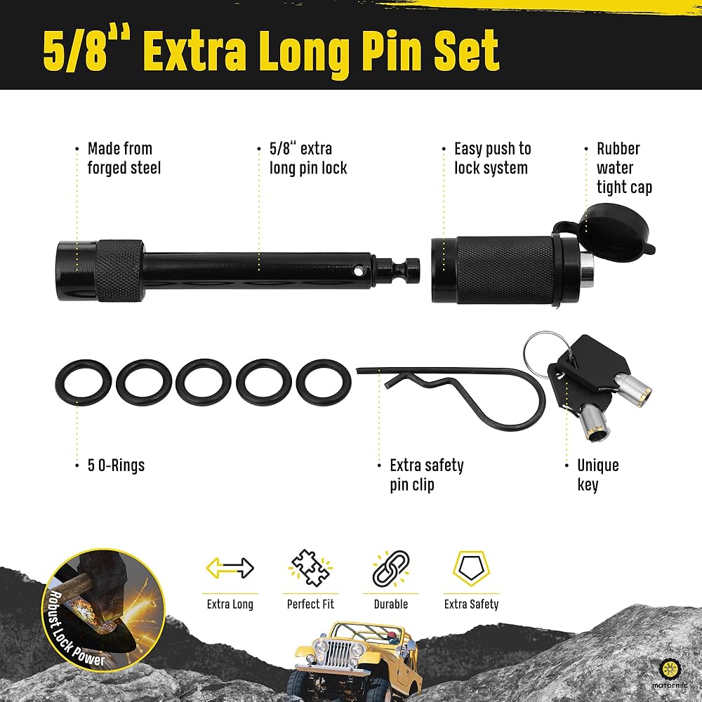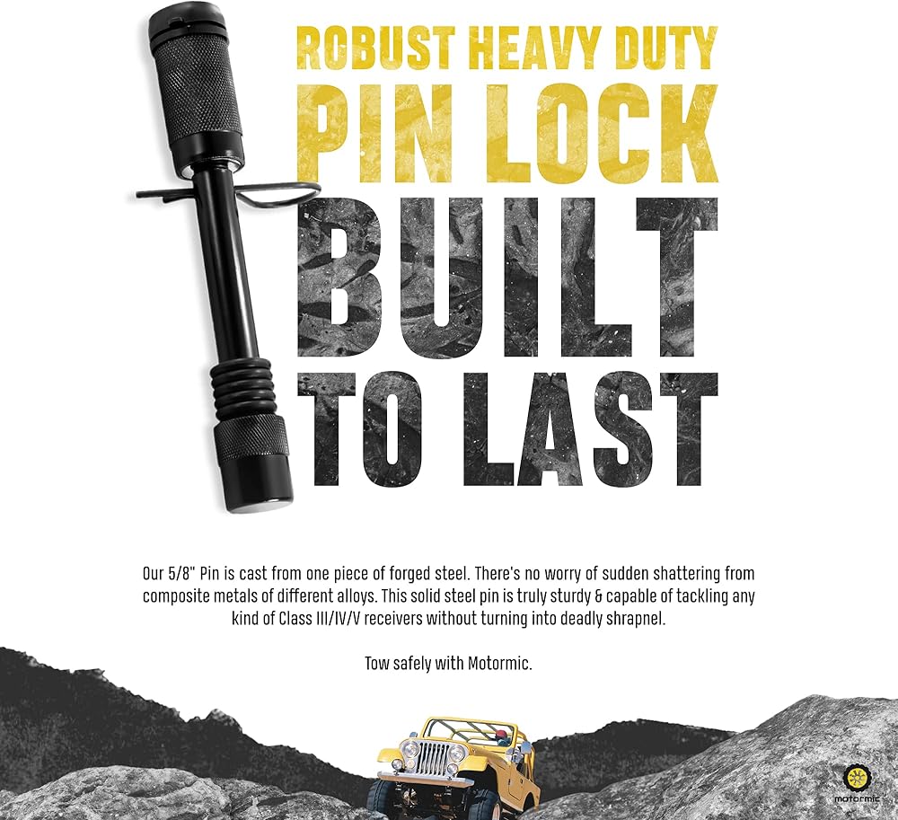 مجموعة مكونة من دبوسين وصلة مقاس 5/8 بوصة مع نظامي قفل يوصى بها لـ - أجهزة استقبال سحب مقاس 2 إلى 2.5 بوصة (الفئة III وIV وV) موثوقة ومجهزة بمشبك أمان إضافي