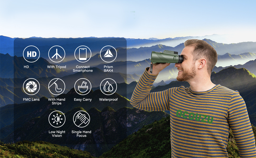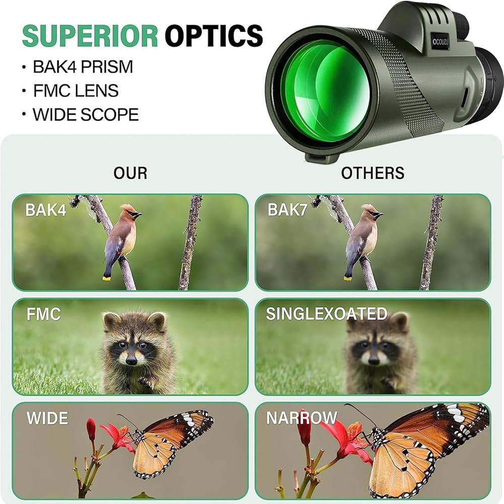 【تباين ودقة عالية】هذا التليسكوب أحادي العين مع منشور BAK-4 وعدسة مطلية بالكامل، يصل نفاذية الضوء إلى 99.9%. تتميز برؤية ليلية منخفضة، ويمكن أن تساعدك على رؤية الأشياء في الإضاءة المنخفضة، للحصول على صور واضحة. مثالية لمشاهدة الطيور على المدى الطويل، وسيارات السباق، وألعاب الكرة، والمشي لمسافات طويلة، ومشاهدة النجوم، واستكشاف الطبيعة.