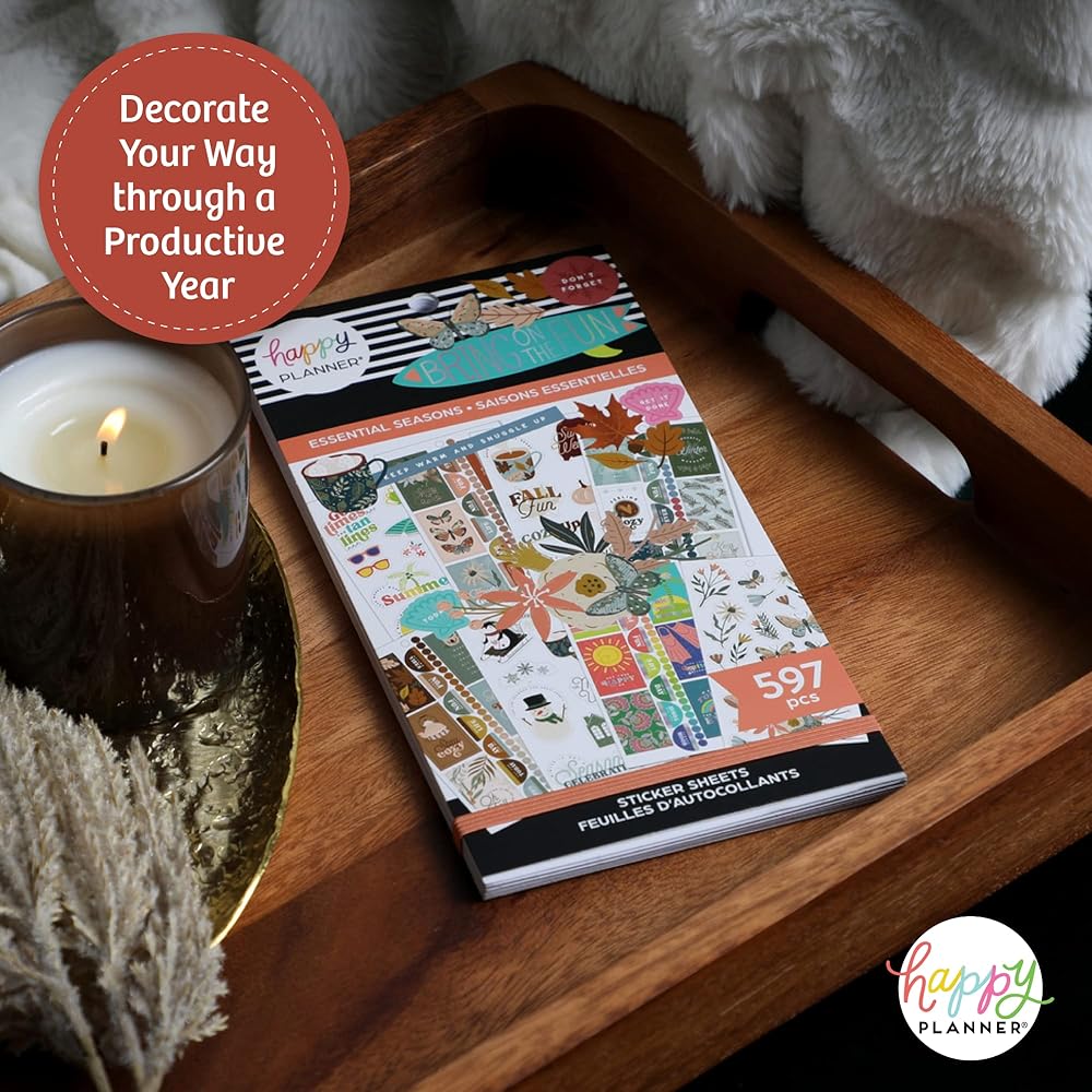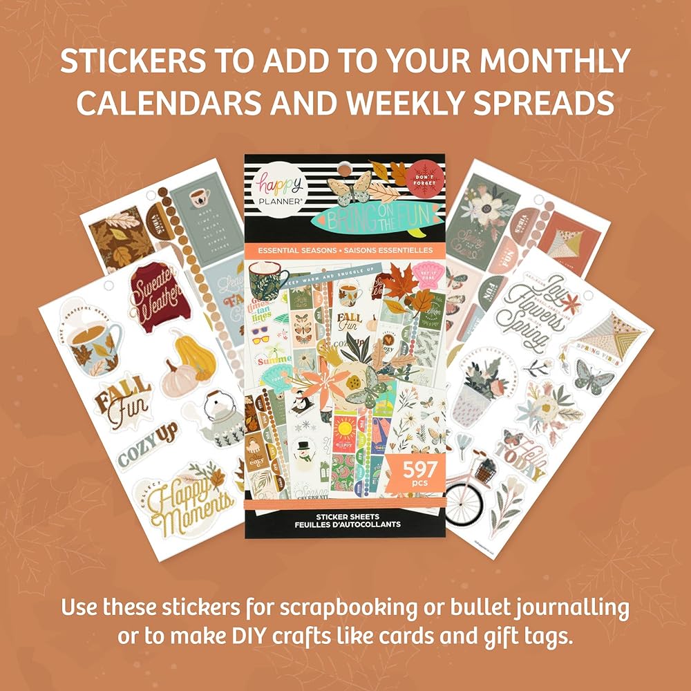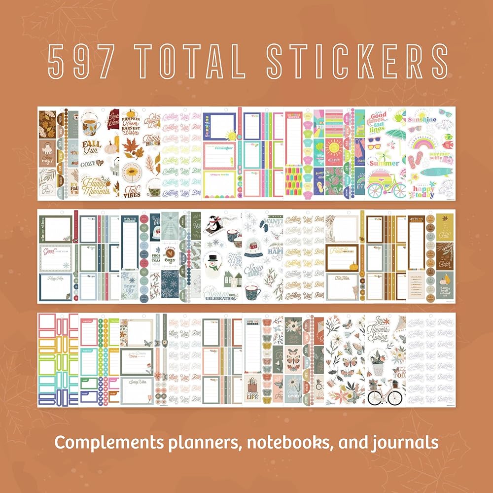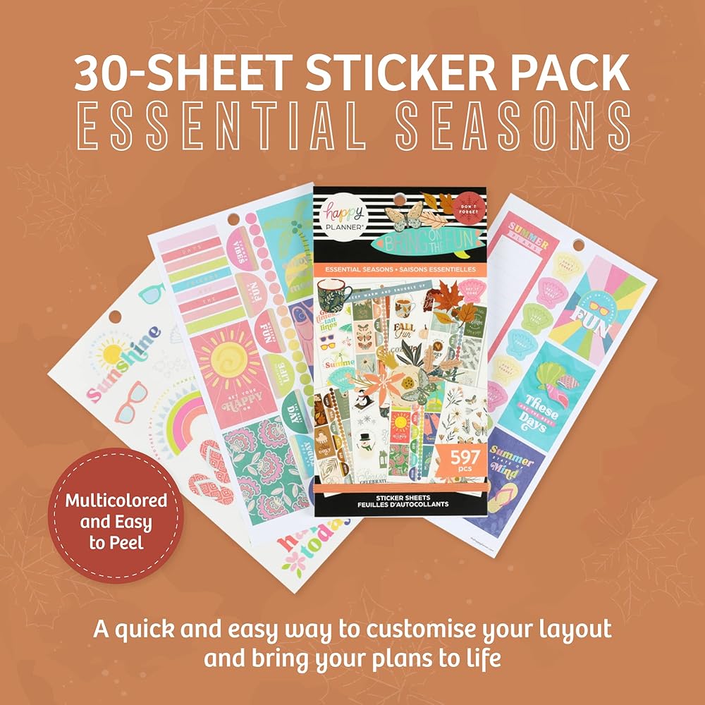 لوحة ملصقات مخططة سعيدة: احتفل بالمواسم والجمال الذي يأتي معها مع مجموعة ملصقات المواسم والاحتفالات هذه. تتضمن مجموعة الملصقات ذات القيمة الإضافية الخاصة بنا 30 ورقة و597 ملصقًا موسميًا لأي مخطط أو دفتر ملاحظات بالحجم الكلاسيكي.