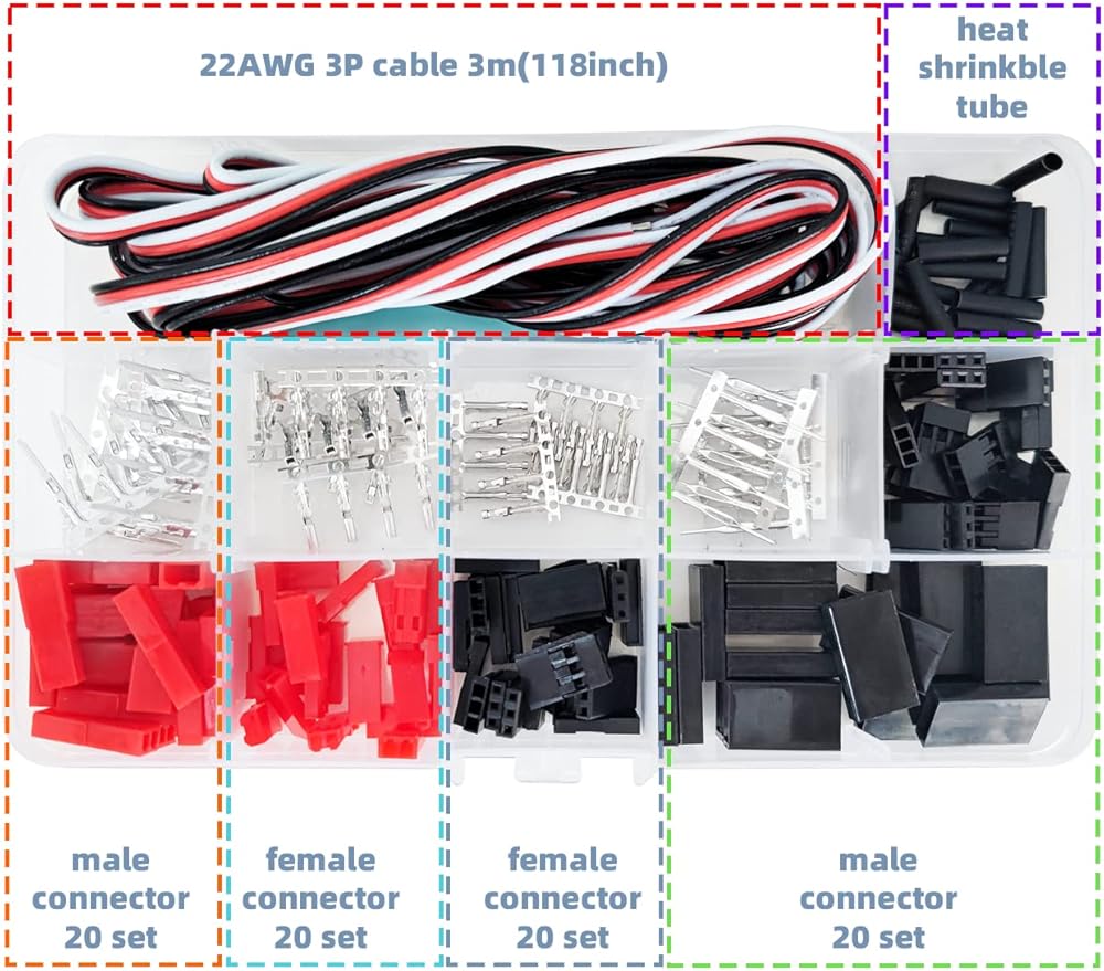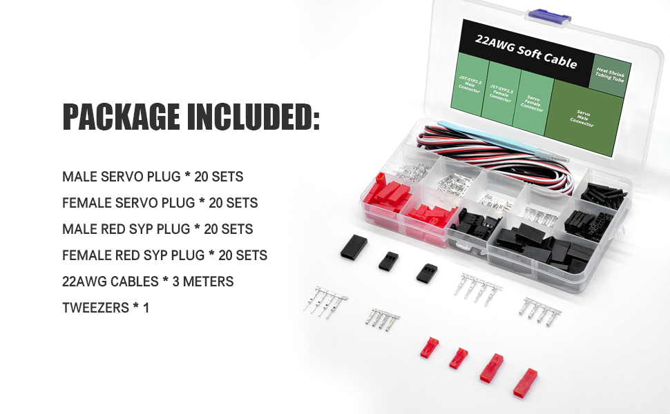 ✔️ 【مجموعة موصلات Jst】تتضمن 20 مجموعة ذكر مؤازر، 20 مجموعة موصل أنثى، 20 مجموعة ذكر أحمر SYP 20، مجموعة موصل SYP أنثى، كابلات 22AWG بطول 3 أمتار، وملاقط في صندوق واحد.